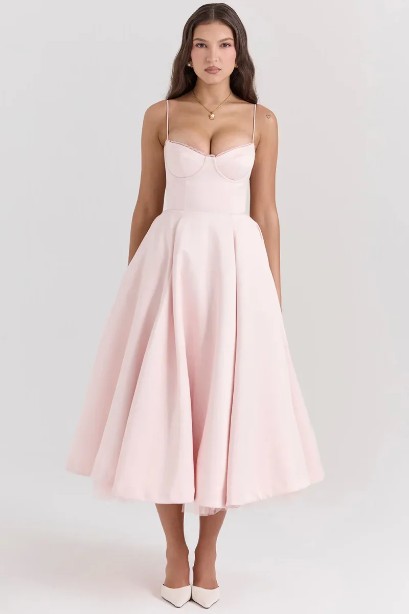 Amara – Robe Midi en Satin | Élégante | Corset & Bretelles Fines