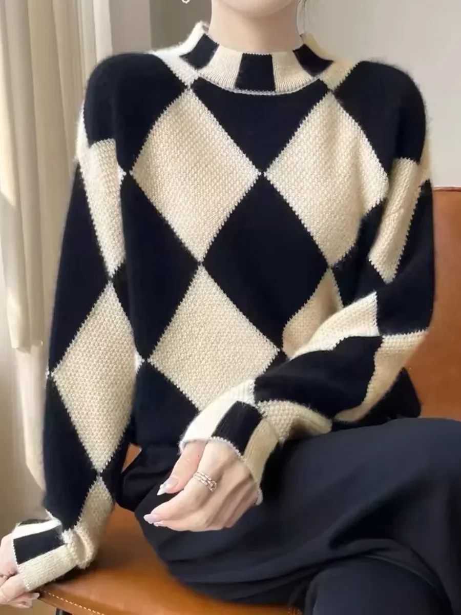 This stand-up collar sweater with black and ecru diamond pattern revisits classic argyle with a modern twist.