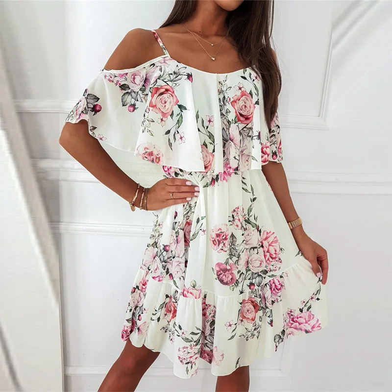Lightweight and feminine, this floral-print short dress seduces with its bare shoulders and delicate ruffles.