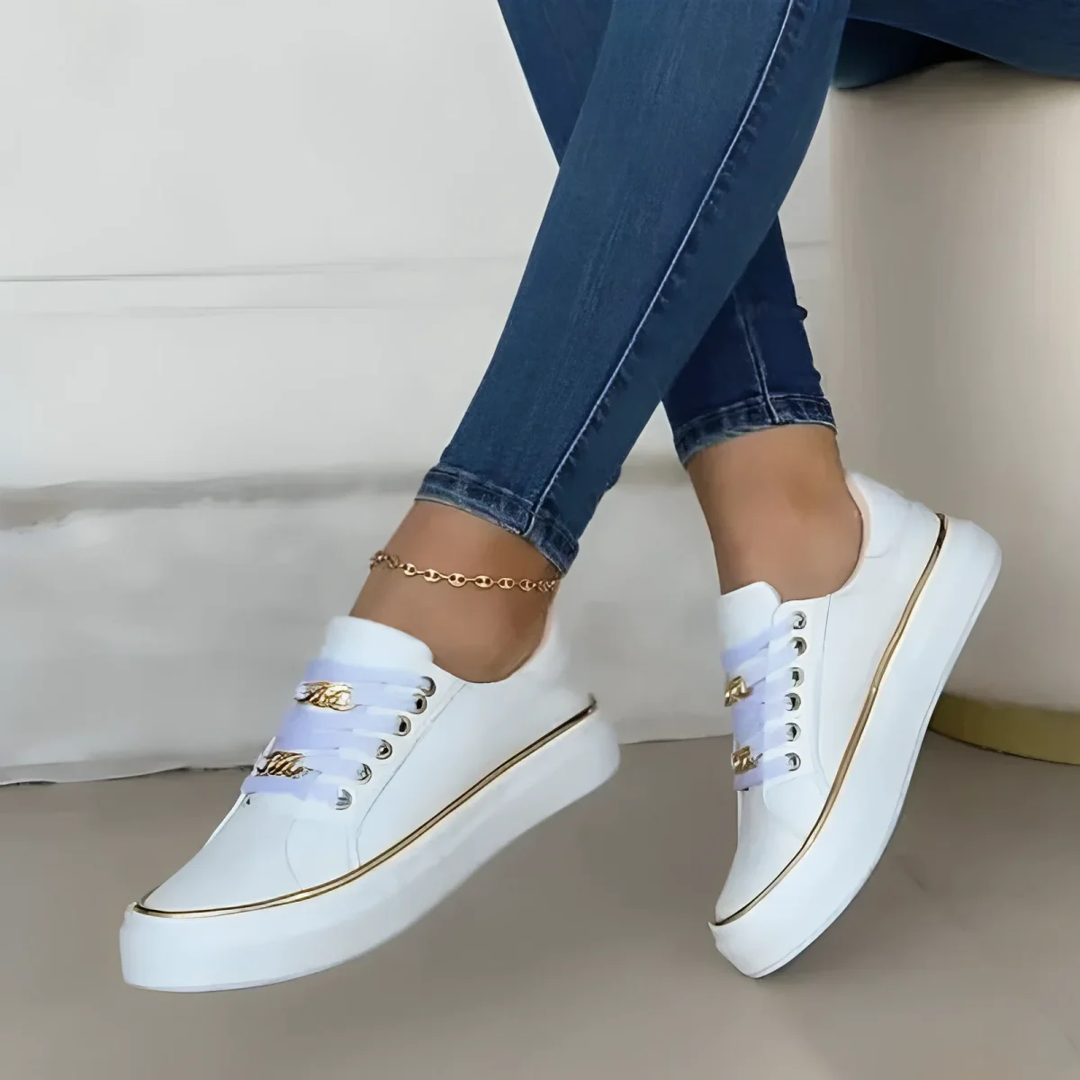 Baskets Blanches Femme | Détails Dorés & Chaînes | Élégantes & Confortables
