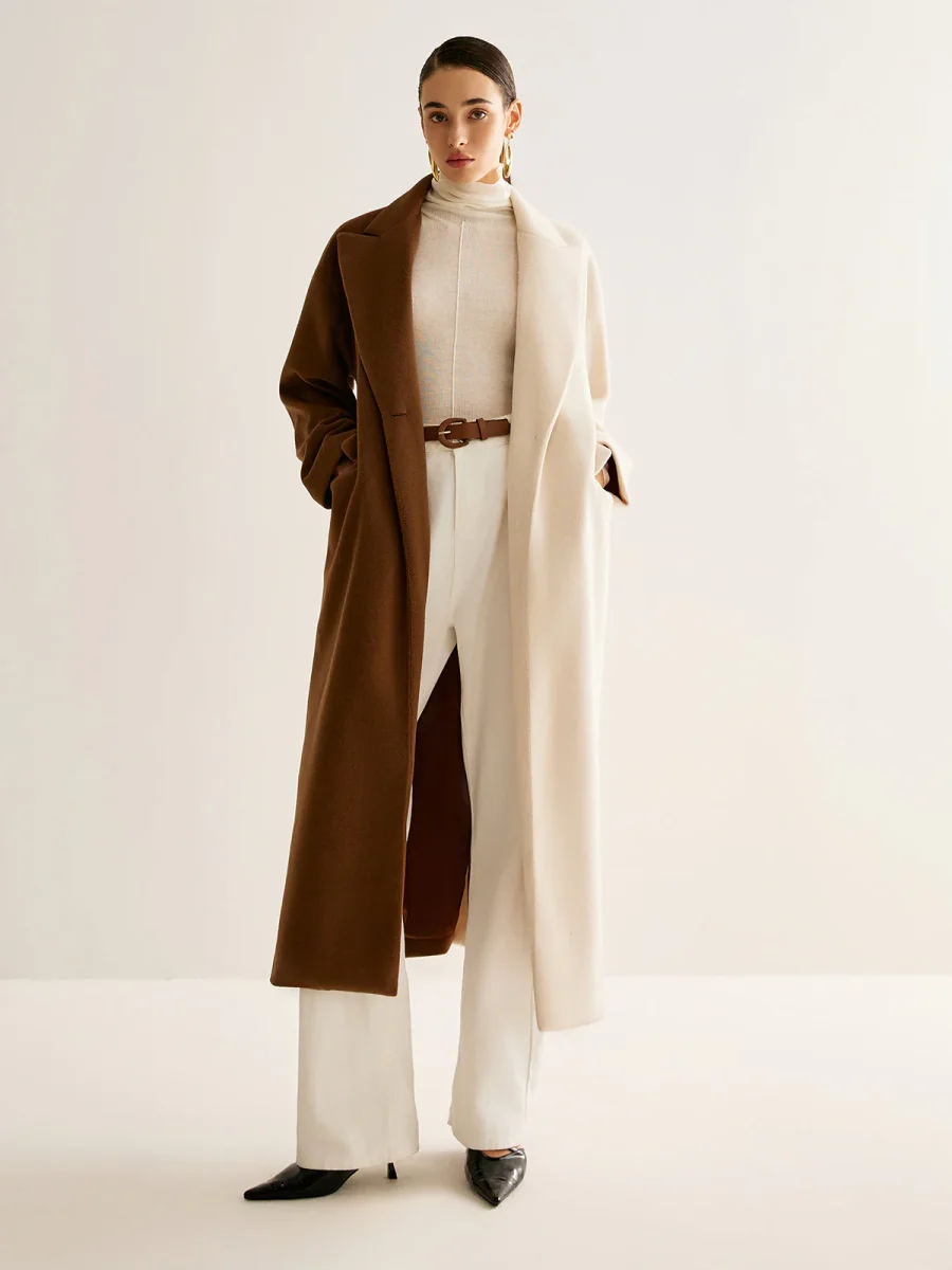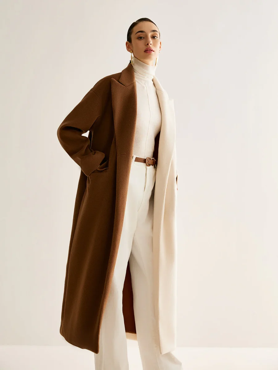 This two-tone long wool coat offers an elegant silhouette with a modern artistic touch.