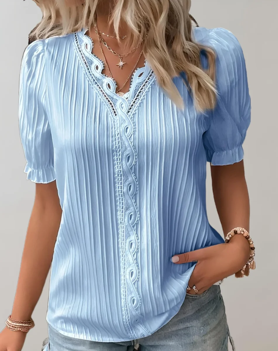 Avec son encolure en V ornée de dentelle délicate et ses manches courtes légèrement bouffantes, elle offre une allure féminine et raffinée.