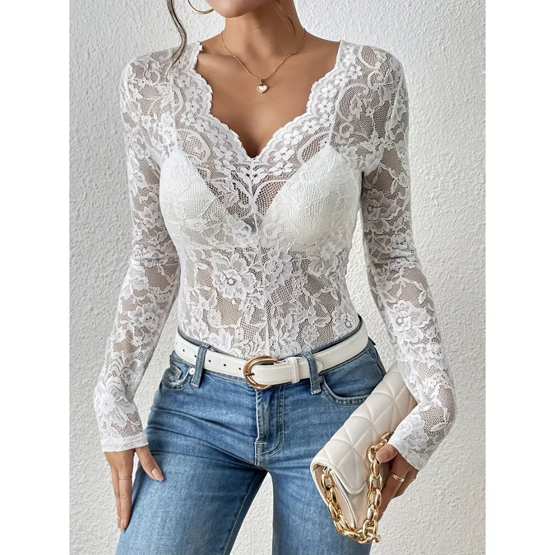 . Design : Body en dentelle avec manches longues et décolleté en V