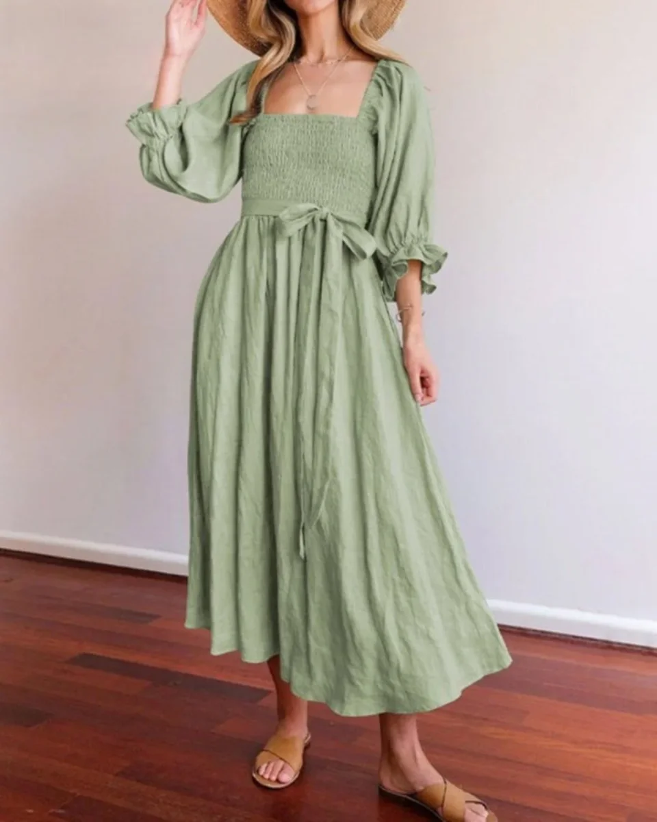 Its smocked bodice gently hugs the silhouette, while puffed sleeves and a belt tied at the waist offer a relaxed, bohemian look.