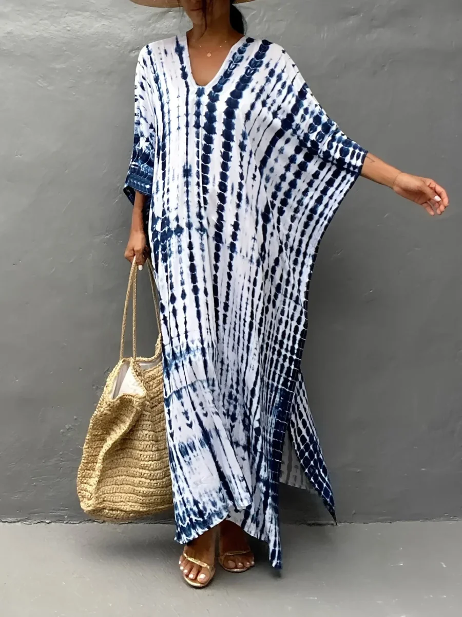 This long caftan in tie & dye pattern captures the free-spirited summer spirit with elegance.