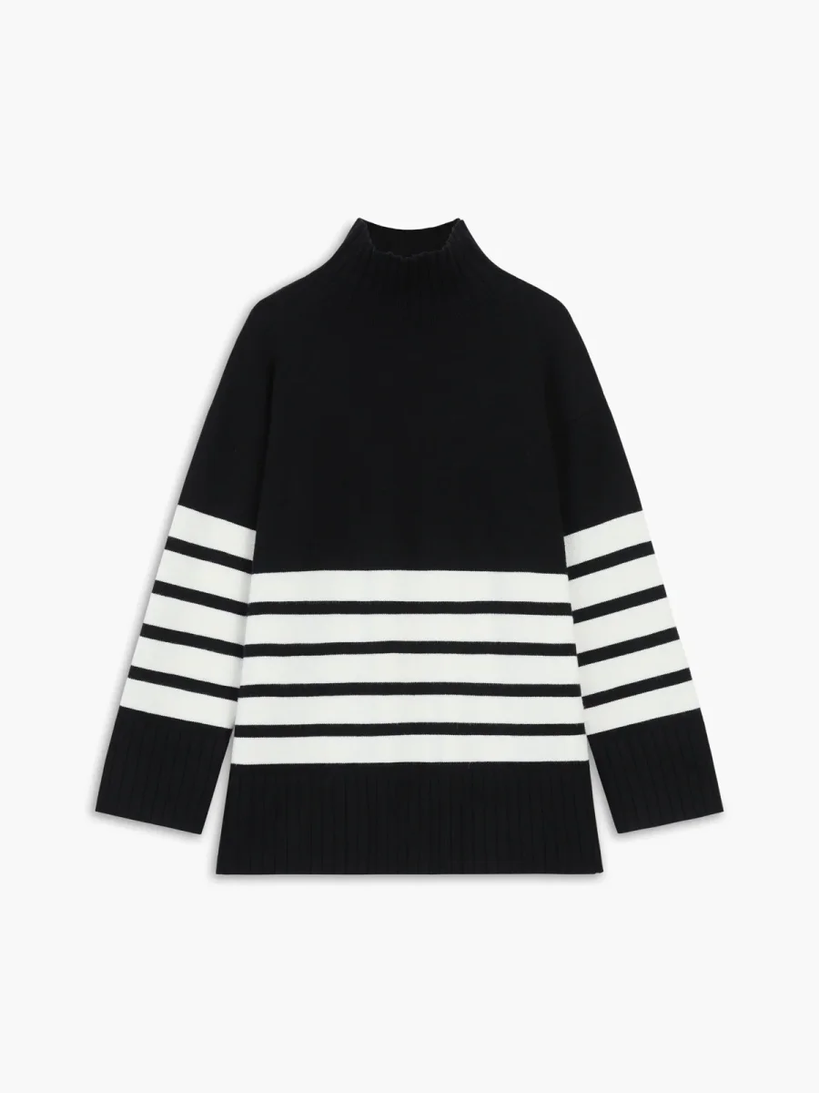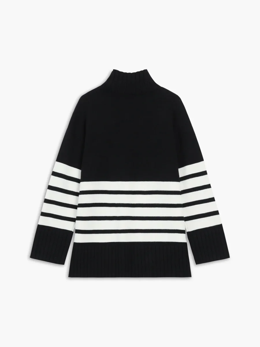 Le Camille est un pull en maille épaisse à col roulé, orné de rayures noires et blanches pour un look intemporel. Sa coupe oversize apporte une touche décontractée tout en restant élégante. Parfait pour un style urbain et sophistiqué, il se porte aussi bien en robe-pull qu’avec un pantalon.