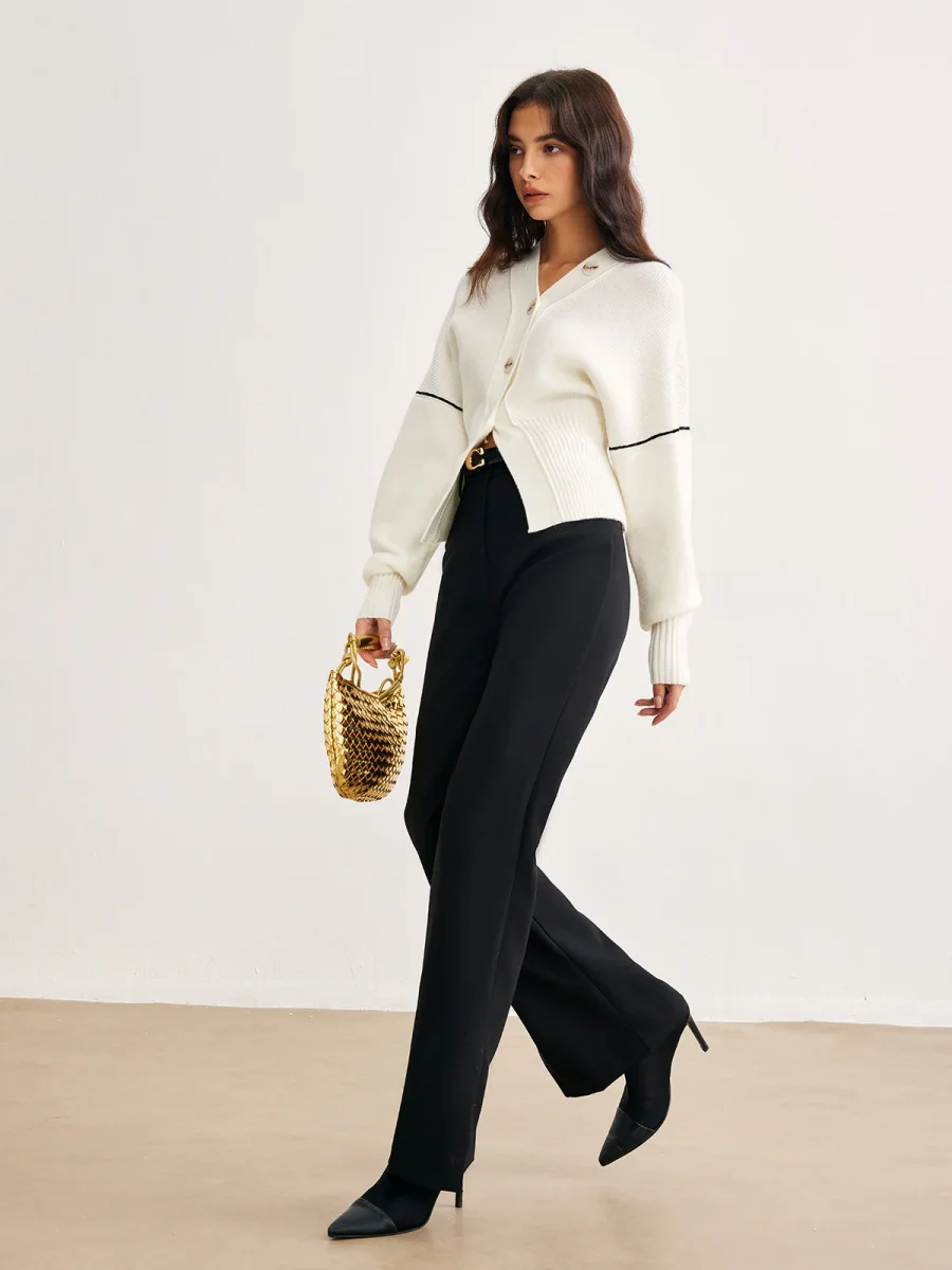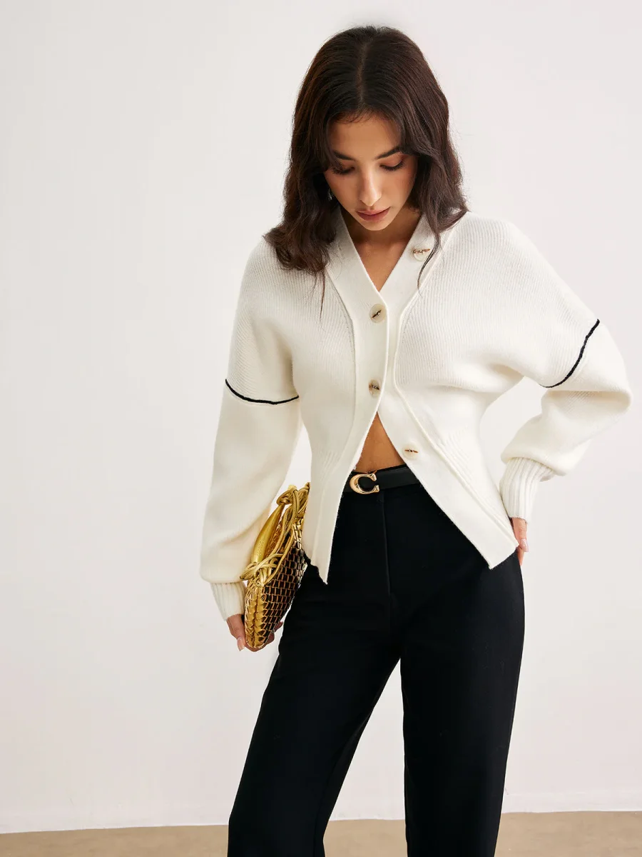 Cardigan Blanc à Détail Contrastant | Maille Moderne | Coupe Ample Élégante