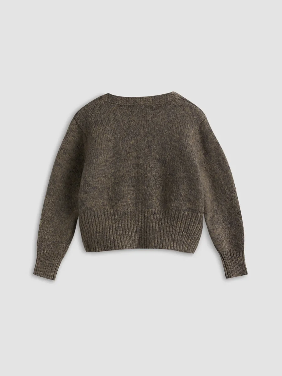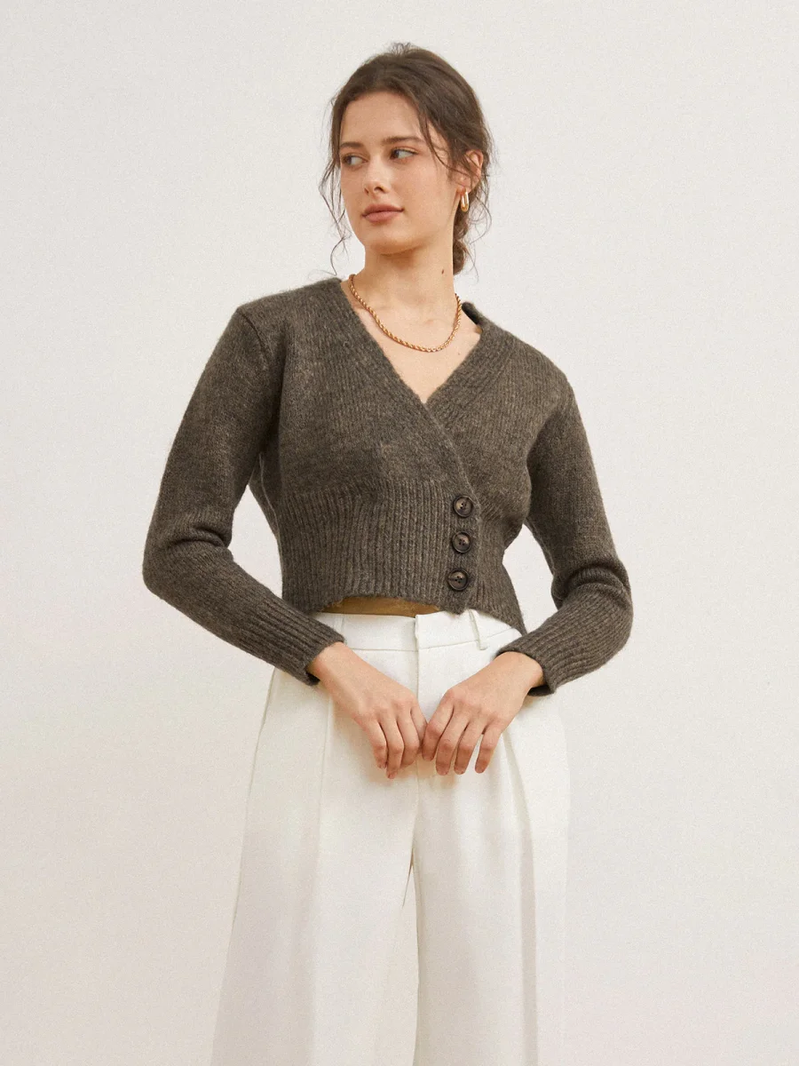 Ce cardigan court kaki en maille douce offre un équilibre parfait entre confort, simplicité et style.