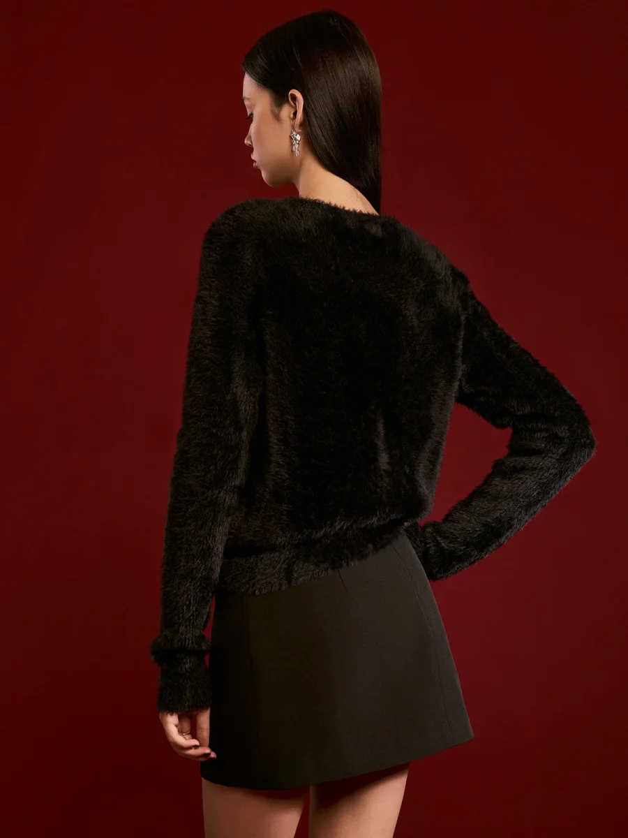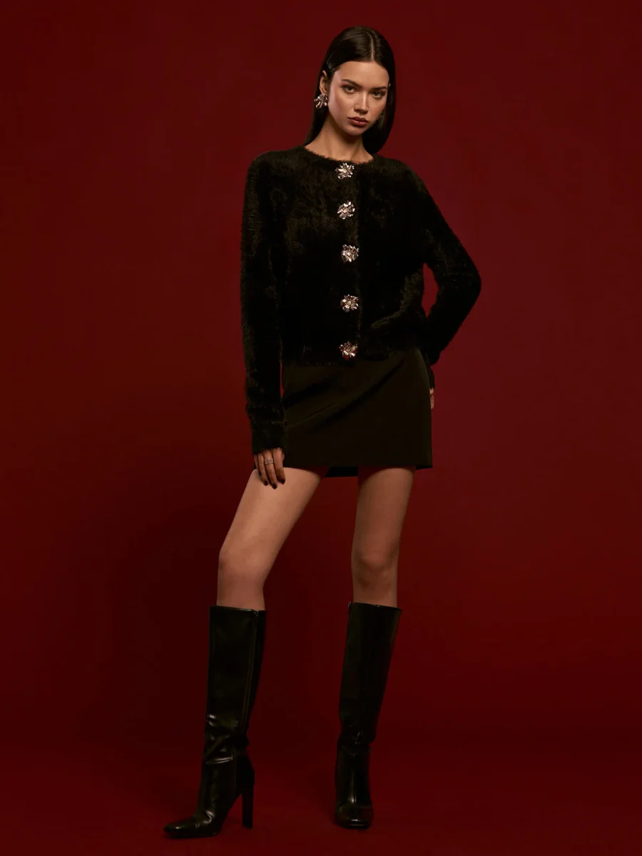 This fluffy-effect black cardigan seduces with its luxurious texture and sparkling jewel buttons.