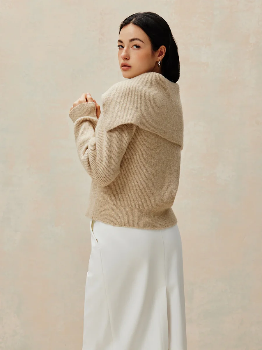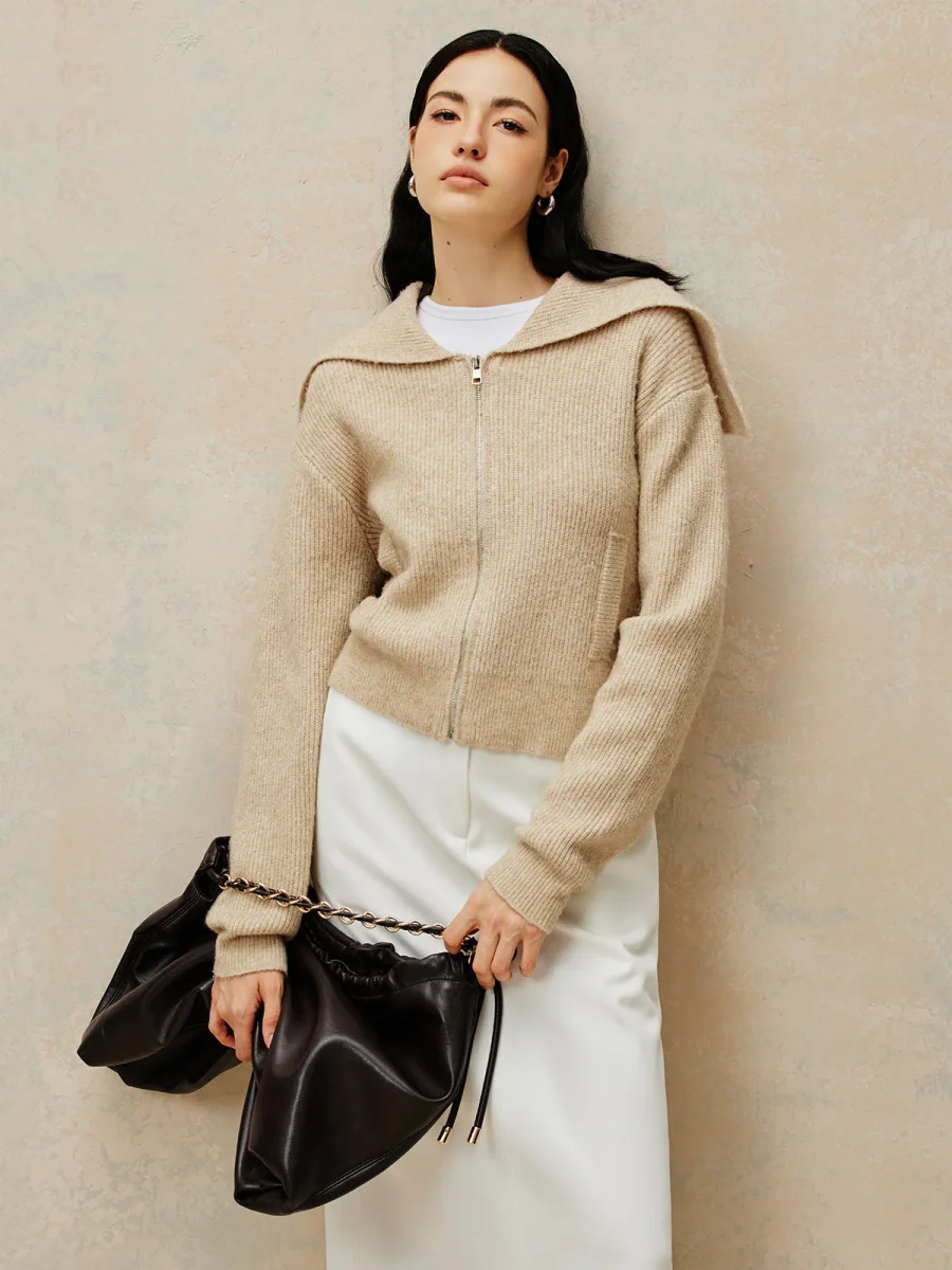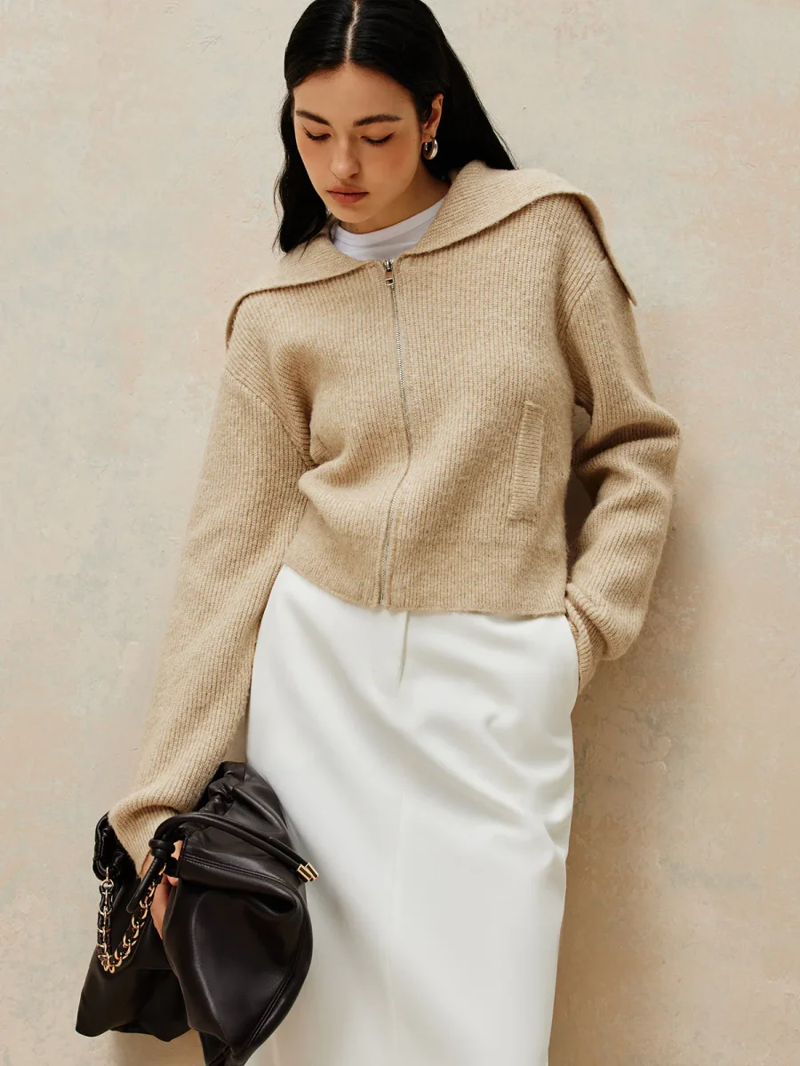 Ce cardigan zippé en maille beige allie confort et modernité avec sa capuche à effet drapé et sa coupe légèrement raccourcie.