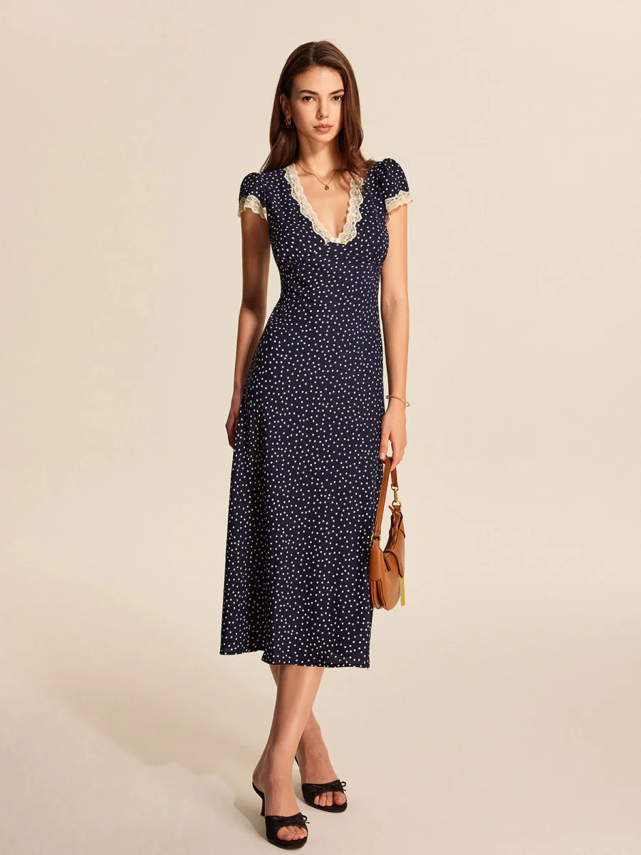 A flowing dress with retro elegance, sublimated by a timeless polka dot print and V-neckline trimmed with delicate lace.