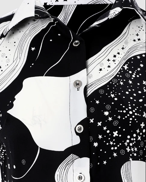 Cette chemise noire et blanche à imprimé abstrait attire tous les regards avec son design artistique et sa coupe féminine.