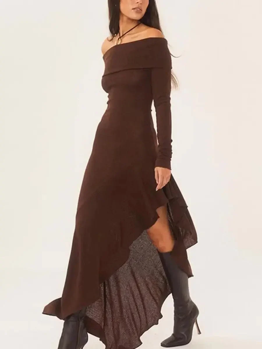 Chocolate Long Dress | Bare Shoulders | Asymmetrical Elegance