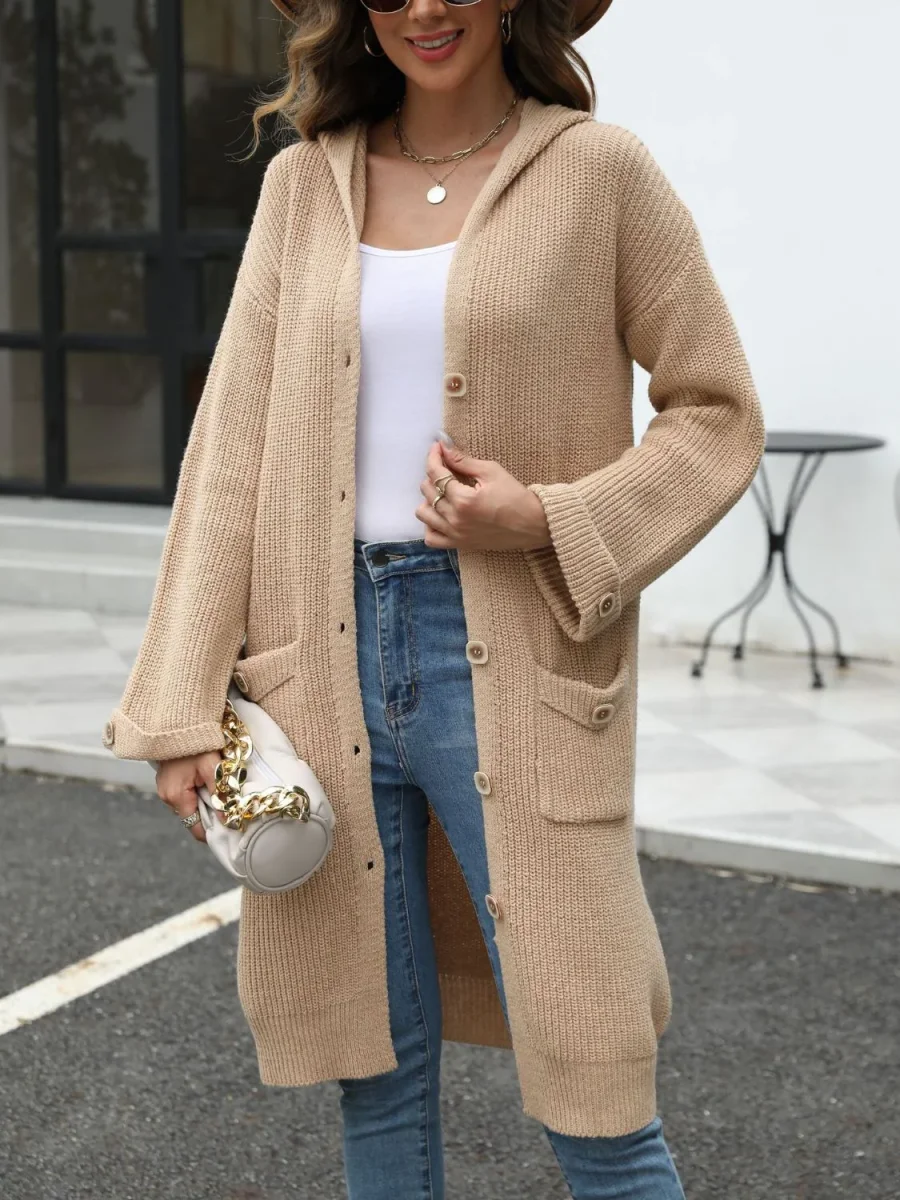 Clara – Cardigan Long Boutonné | Maille Côtelée | Élégant & Polyvalent