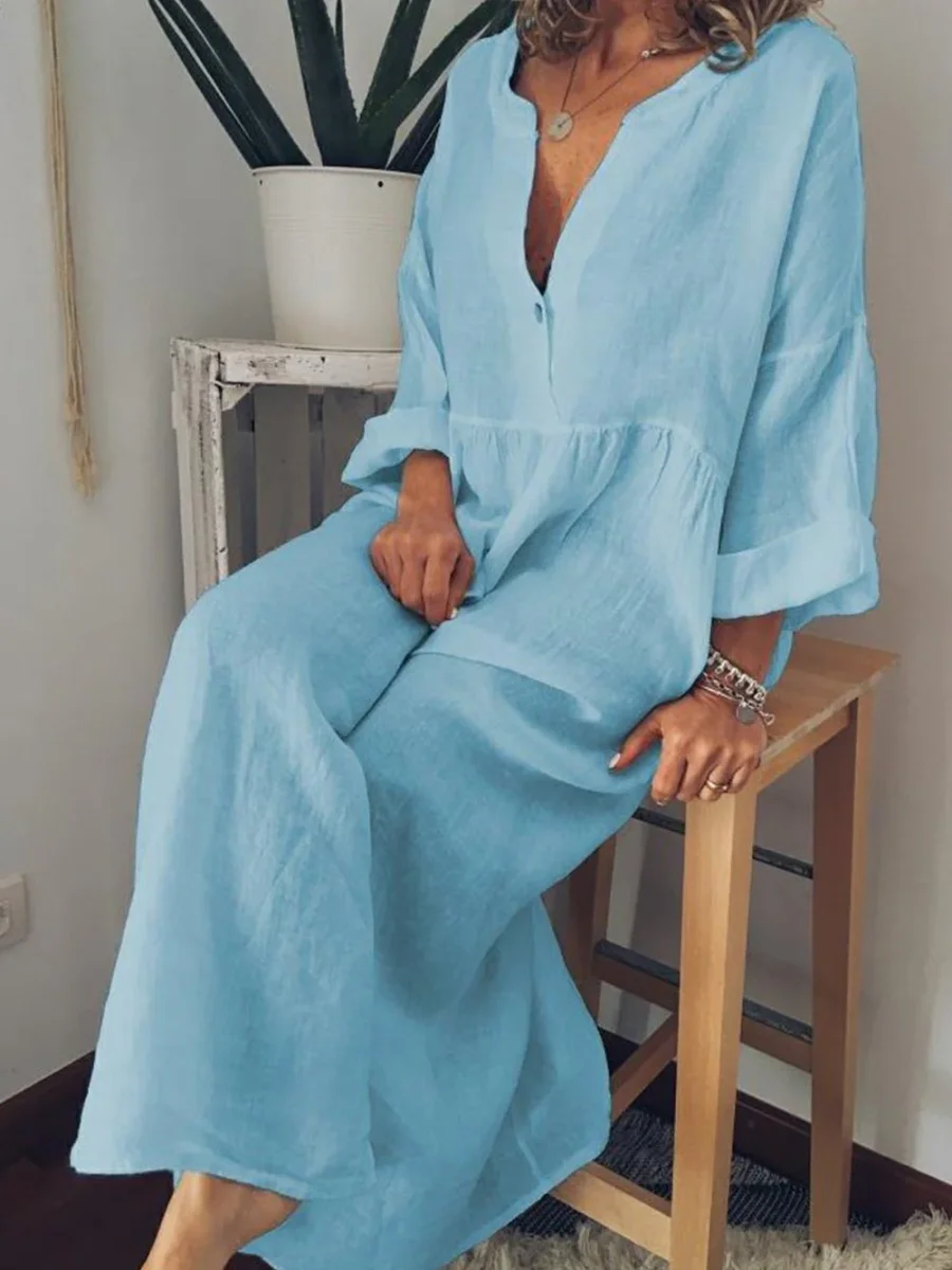 Dotée de manches longues évasées et d’un décolleté en V boutonné, elle offre une silhouette fluide et raffinée.