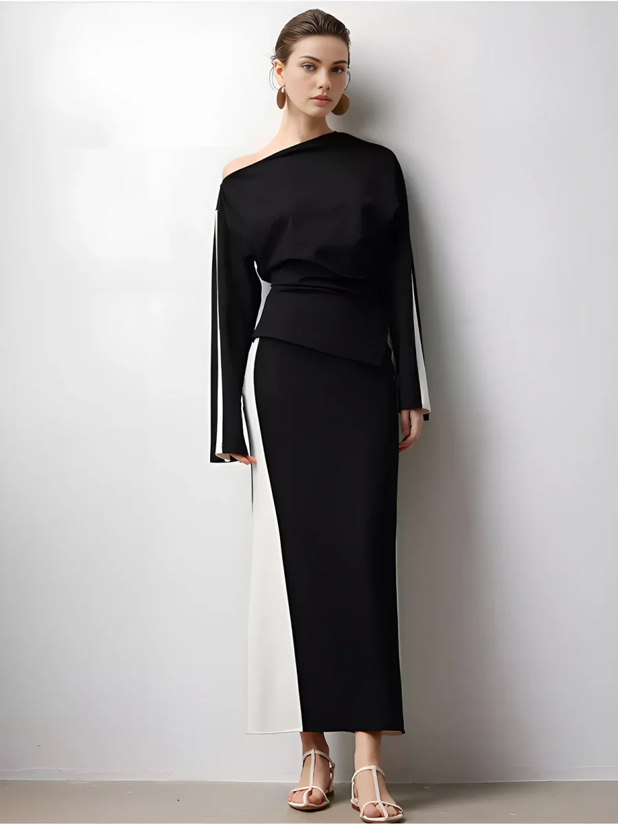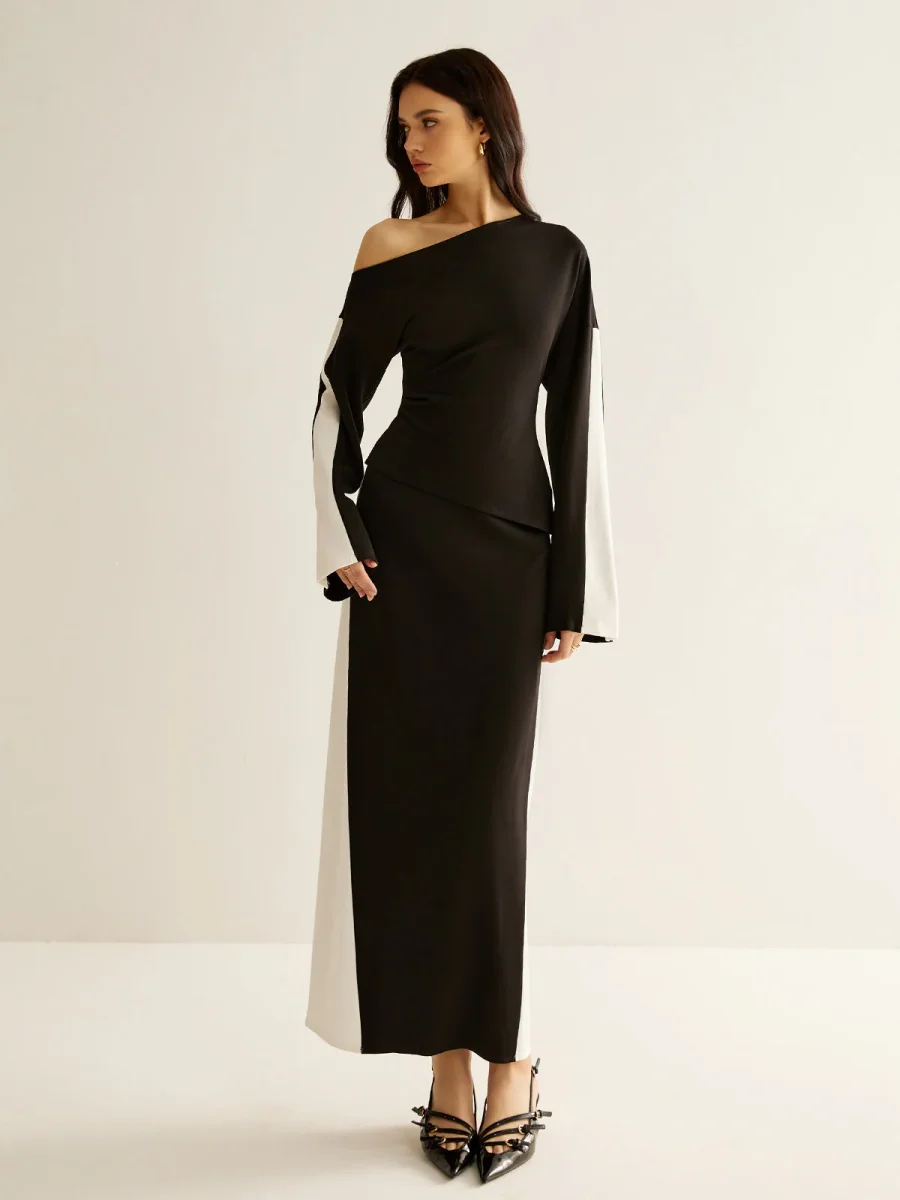 Elegant, Asymmetrical and Structured Cotton Bicolour Maxi Dress
