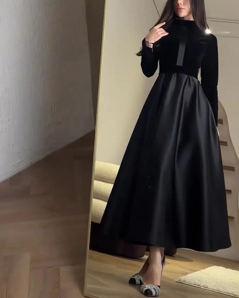 Need an elegant dress for a dressy event or formal evening this winter?This black dress with stand-up collar perfectly blends velvet and satin texture for a look that’s both modern and timeless.The fitted top contrasts with the flared skirt, creating a feminine, structured silhouette. Specifications– Material: Velvet top & textured cotton blend skirt (polyester-free)– Contrasting […]