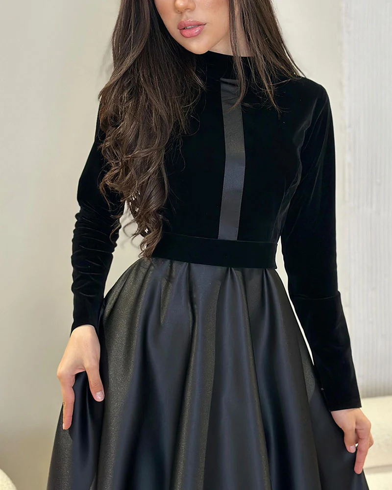 This black dress with stand-up collar perfectly blends velvet and satin texture for a look that’s both modern and timeless.