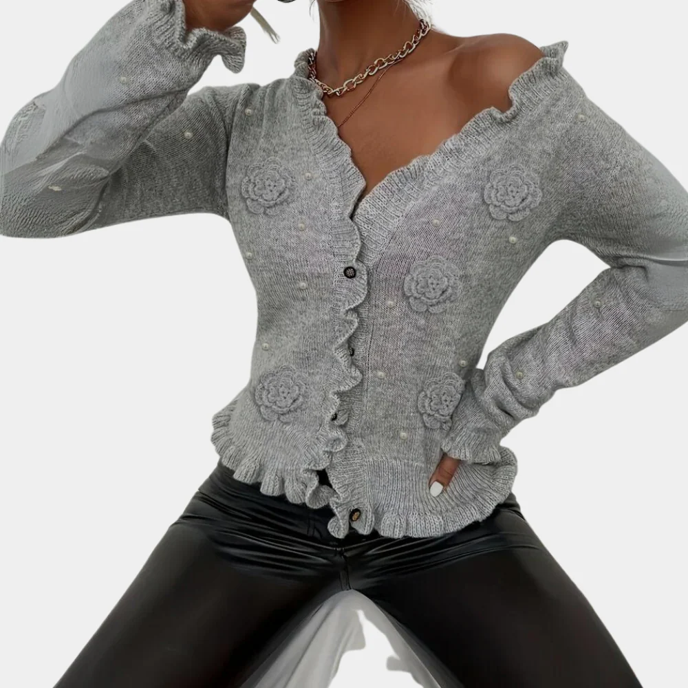 This pearl-gray knitted cardigan adorned with embossed flowers and delicate pearls adds a soft, elegant touch to your style.