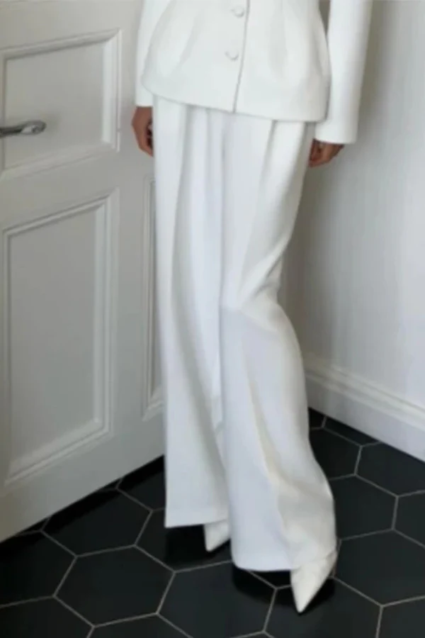 The slim-fitting jacket with plunging neckline blends perfectly with flowing wide-leg pants, creating an elongated, sophisticated silhouette.