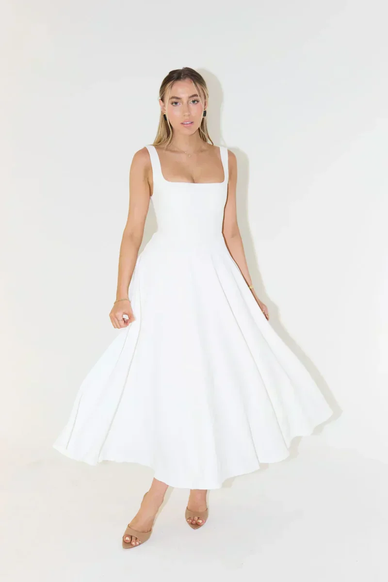 Elena – Robe Midi Évasée | Élégante | Col Carré & Bretelles Larges