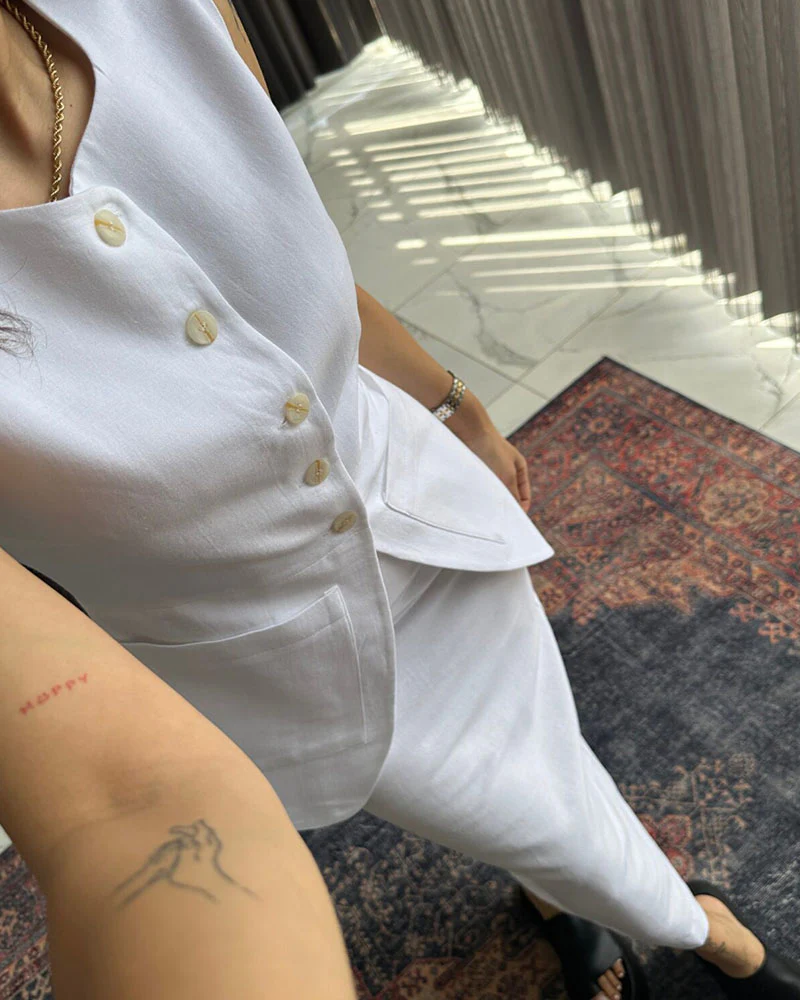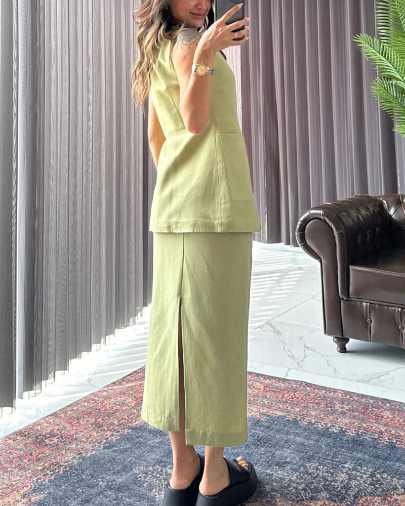 Cet ensemble deux pièces blanc associe une veste sans manches boutonnée à une jupe midi droite pour un look sophistiqué et intemporel.