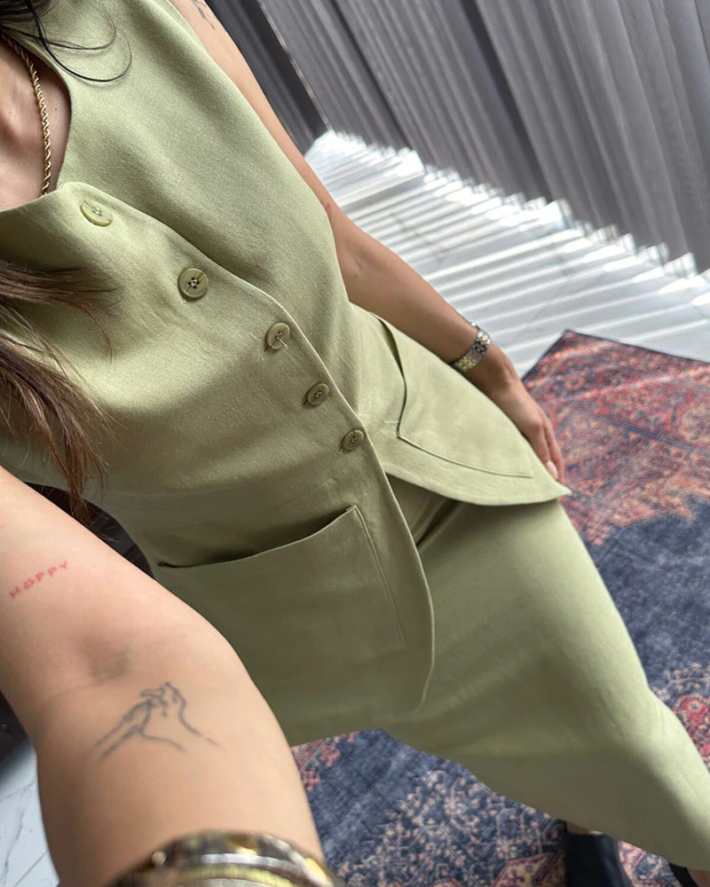 • Design du haut : Veste sans manches avec col rond, poches plaquées et fermeture à boutons