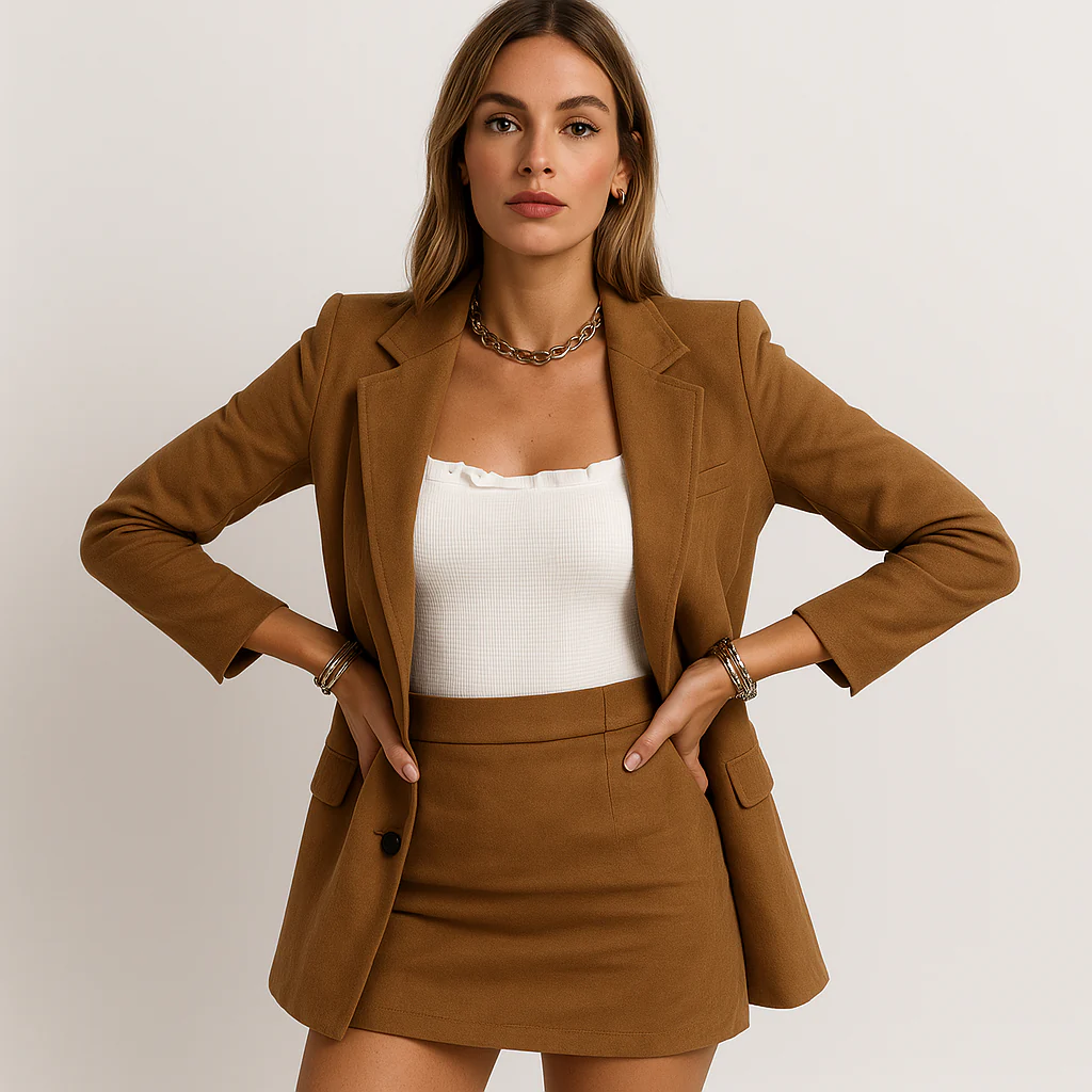 Cet ensemble blazer et jupe courte camel incarne la puissance et l’élégance féminine avec une touche minimaliste.