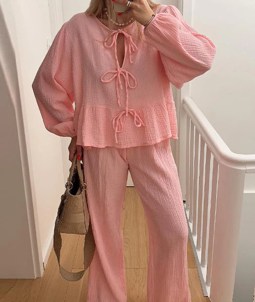 • Ensemble composé de : Haut à manches longues noué à l’avant et pantalon fluide taille élastique