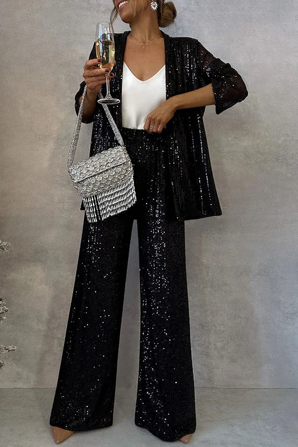 Ensemble de Soirée Femme | Sequins Dorés | Pantalon Large & Veste Fluide