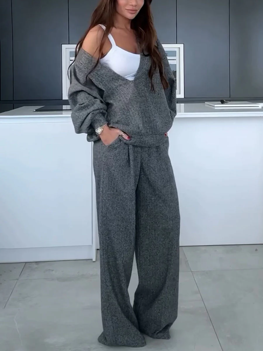 Cet ensemble deux pièces gris mêle une coupe décontractée à un style élégant, parfait pour rester sophistiquée sans renoncer au confort.