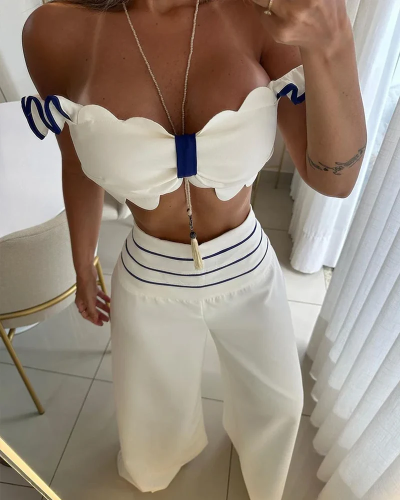 • Ensemble composé de : Top court bustier à volants et pantalon taille haute à jambes larges