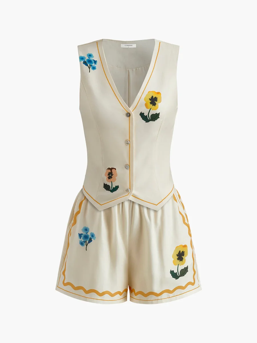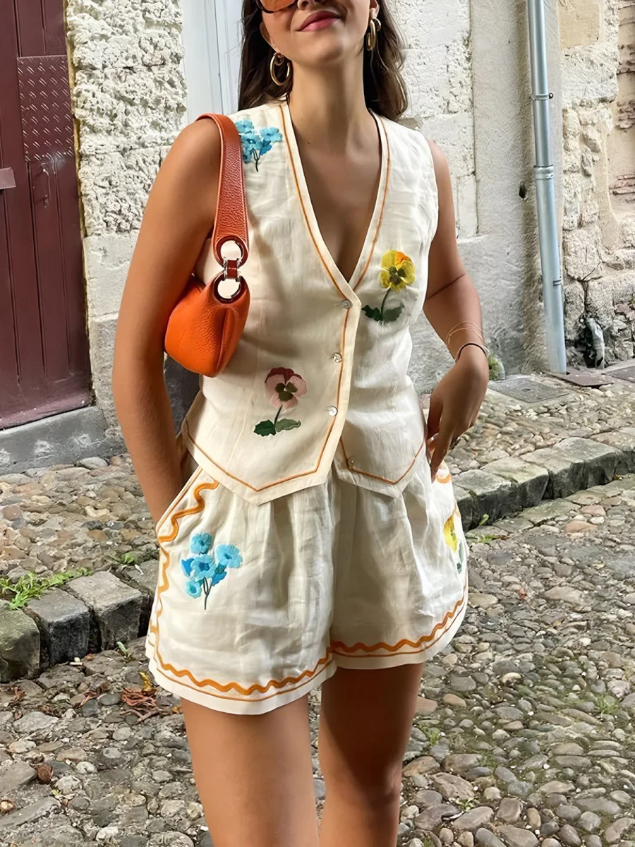 . Design : Gilet sans manches, short taille haute, motifs floraux brodés, détails décoratifs en bordure