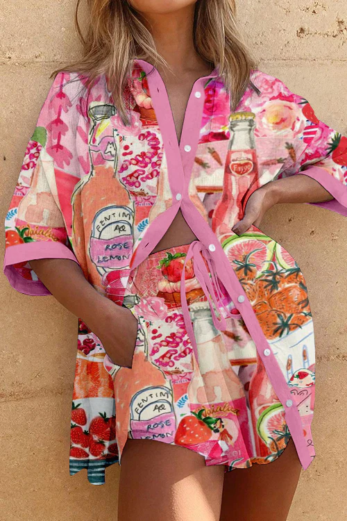 Ce set deux pièces à imprimé “cocktail & fruits” respire l’été et la bonne humeur avec ses motifs de bouteilles, agrumes, fraises et fleurs éclatantes.