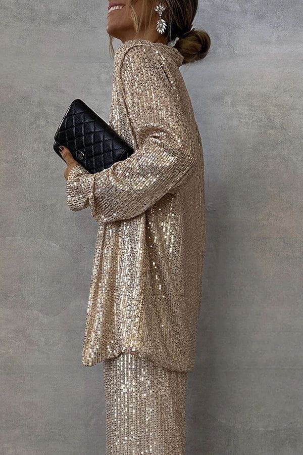 Faites sensation avec cet ensemble deux pièces scintillant, composé d’un pantalon large et d’une veste fluide ornés de sequins couleur champagne.