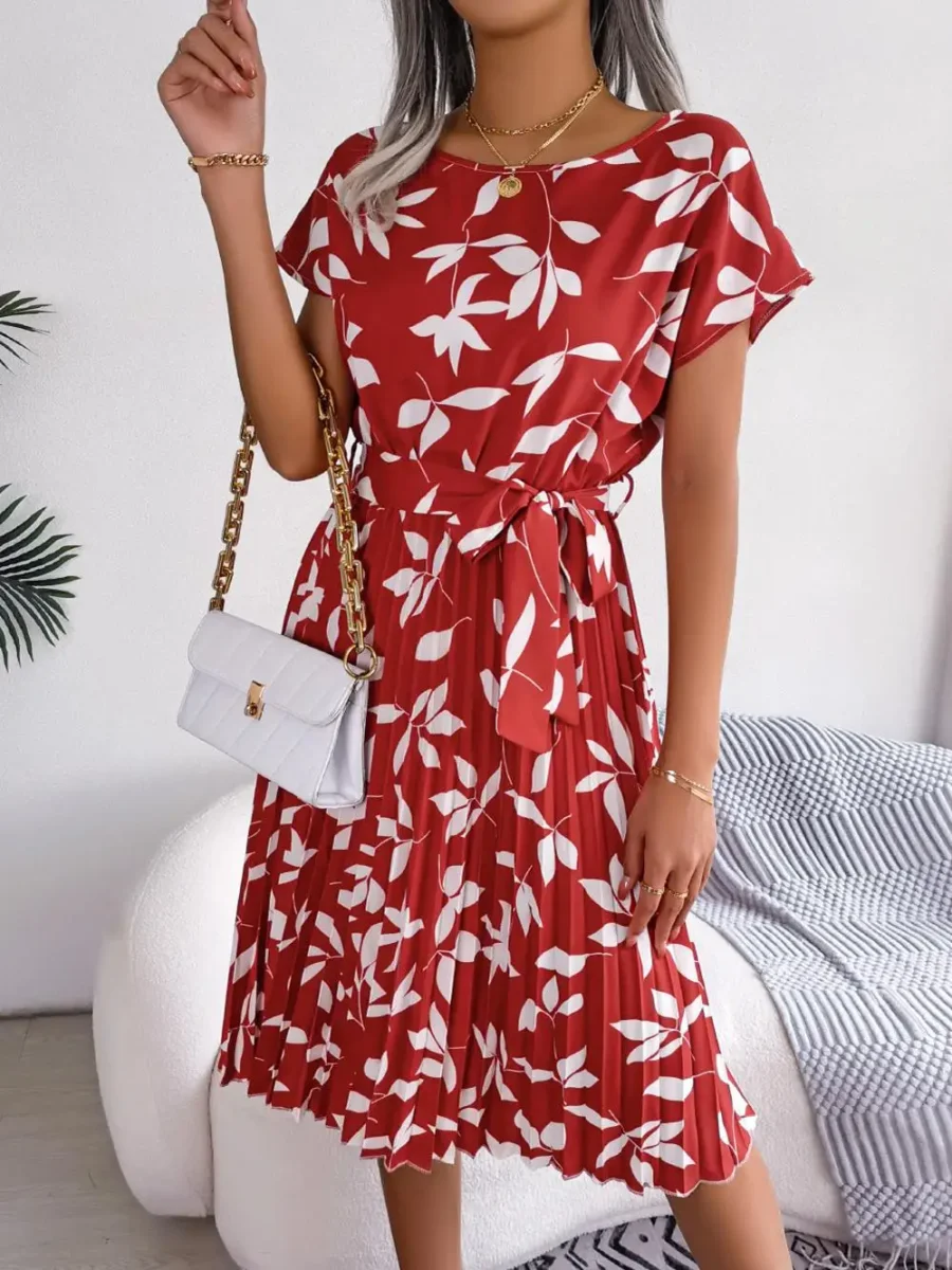 This royal blue pleated dress, enhanced by a white foliage print, flatters the figure with a belted waist and fluid fall.