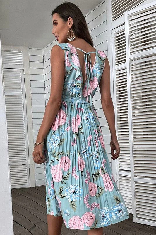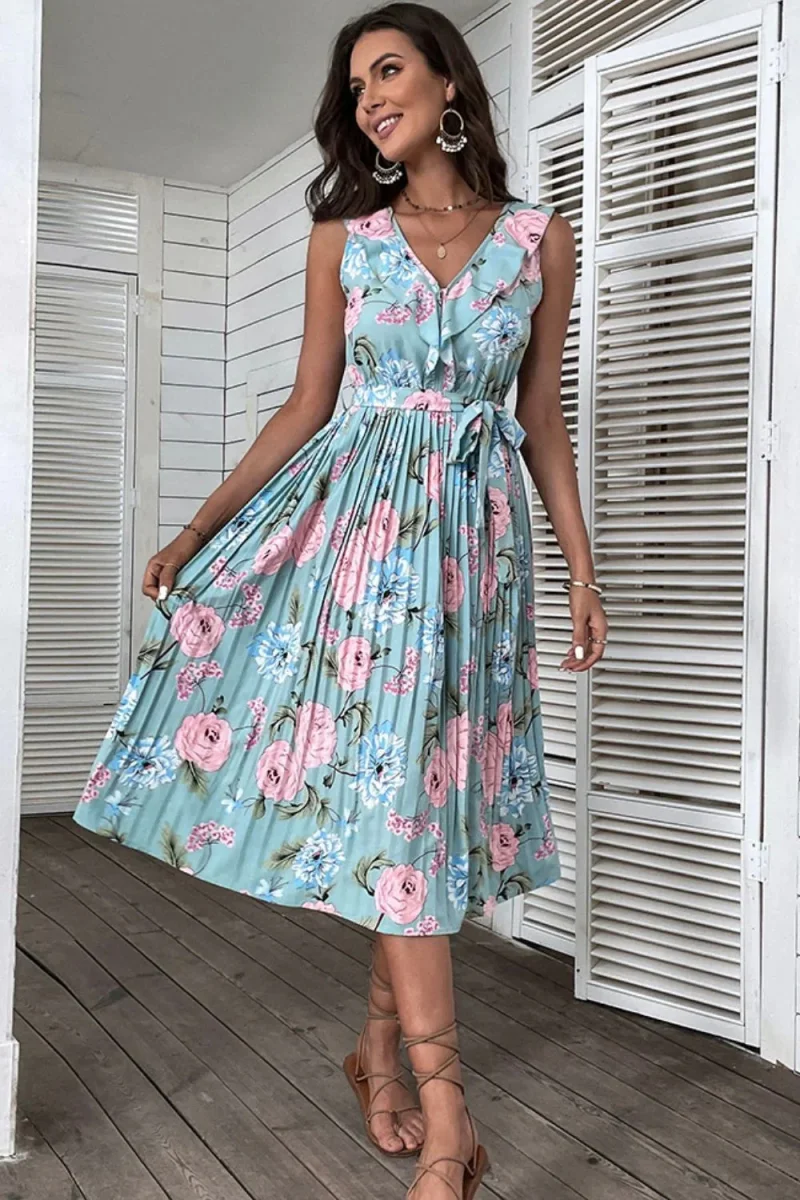 This sleeveless, pleated dress features a delicate floral print, a ruffled collar and a belted waist that accentuates the silhouette.