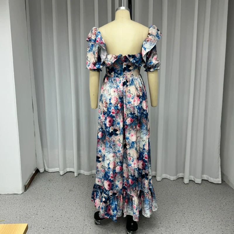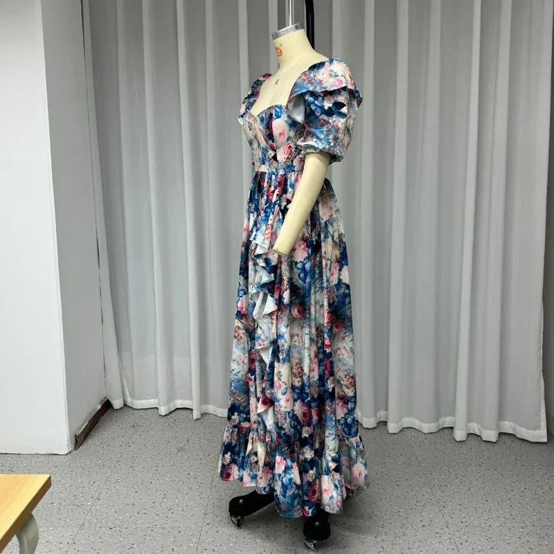 Featuring puffed sleeves and a structured sweetheart neckline, it boasts dramatic ruffles and a bold front slit that adds movement to every step.