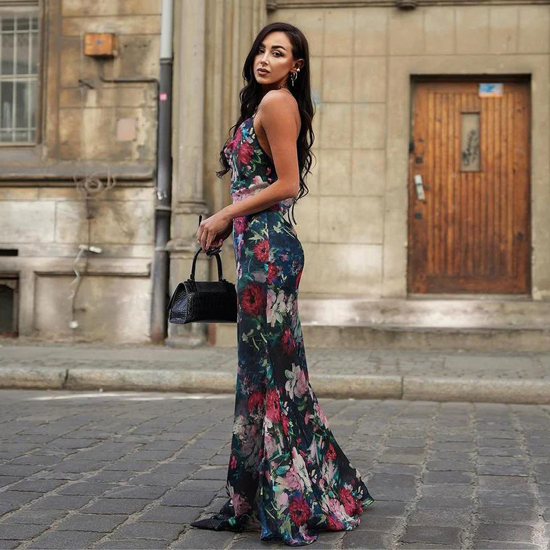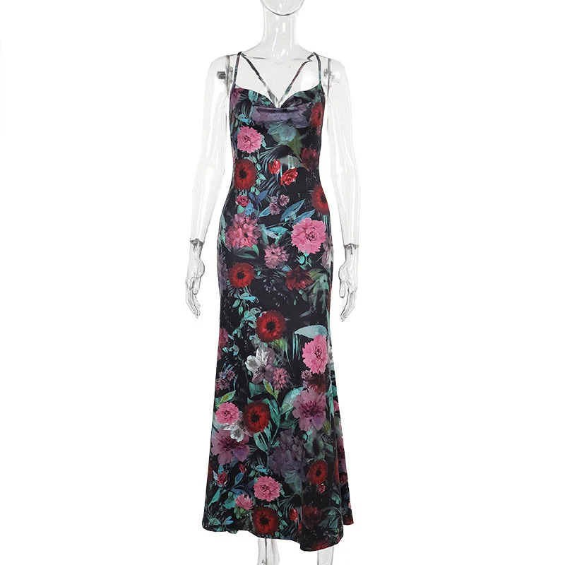 This satiny maxi dress enhances curves with bewitching fluidity and an intense floral print.