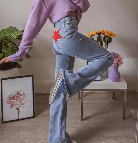 Ce jean baggy taille haute avec imprimé étoilé sur l’arrière est parfait pour un look streetwear tendance. Sa coupe large assure un confort optimal et un style audacieux qui ne passera pas inaperçu.