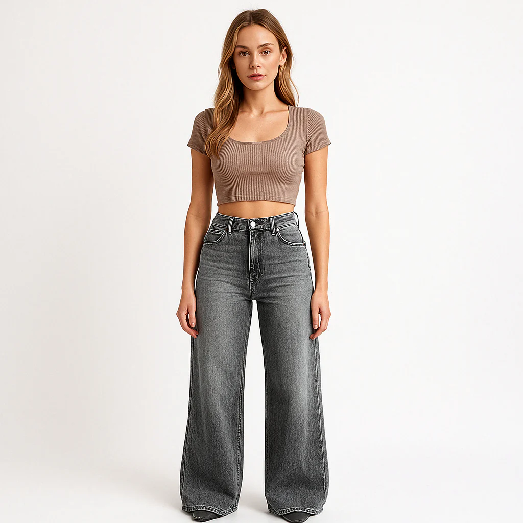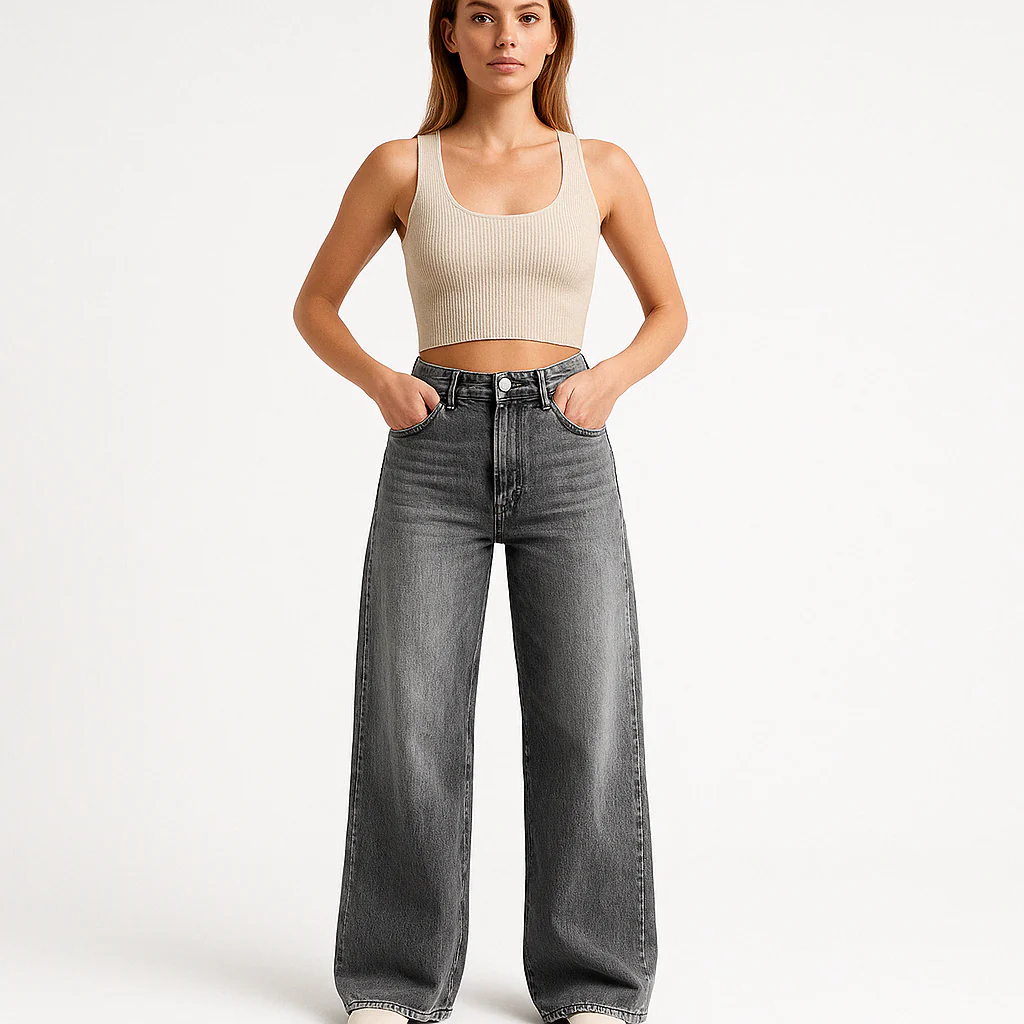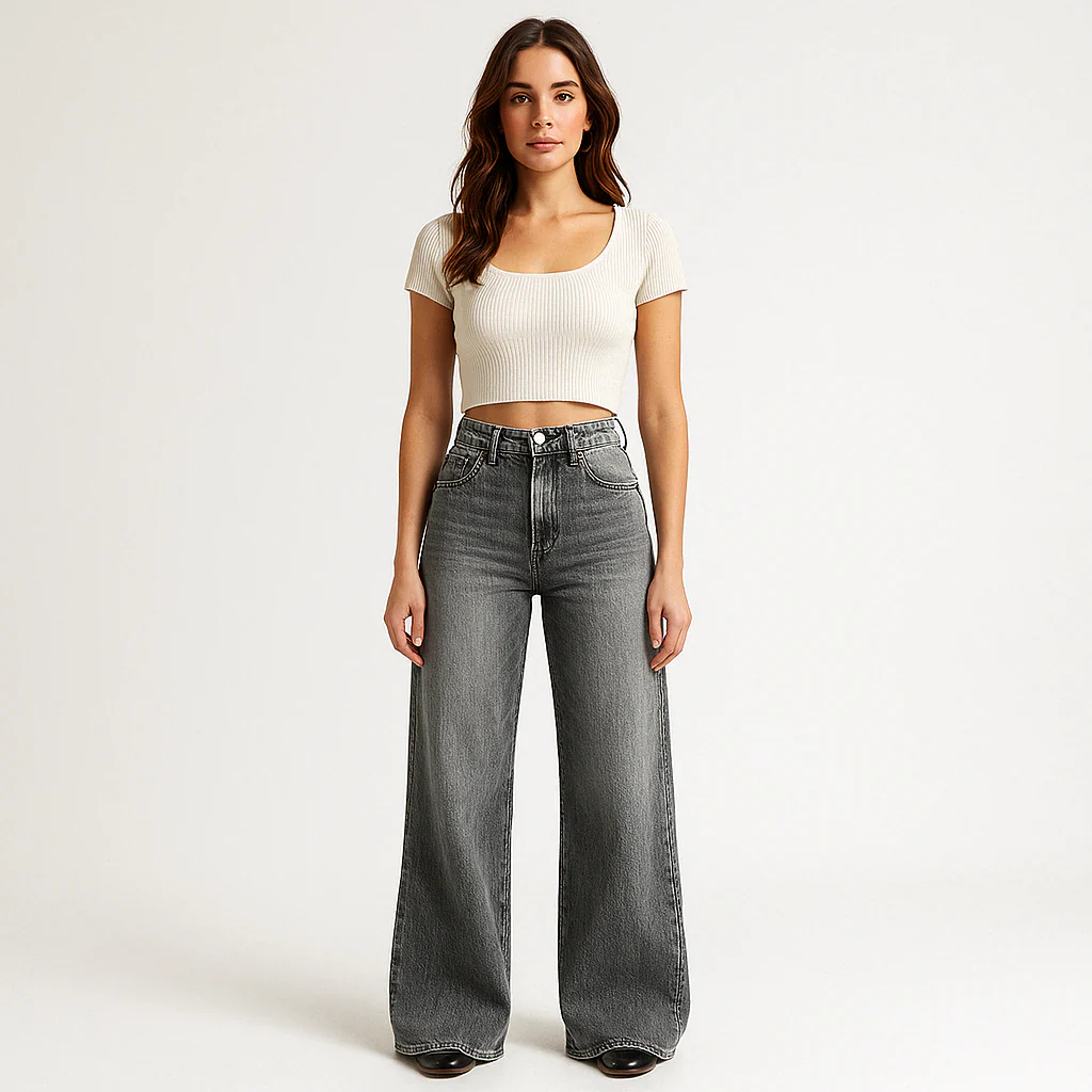 Ce jean à jambe large et taille haute offre une silhouette allongée avec une touche rétro parfaitement dans la tendance actuelle.