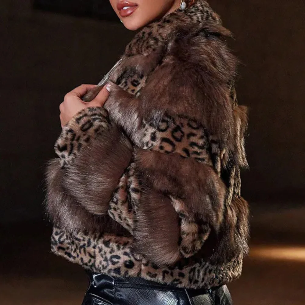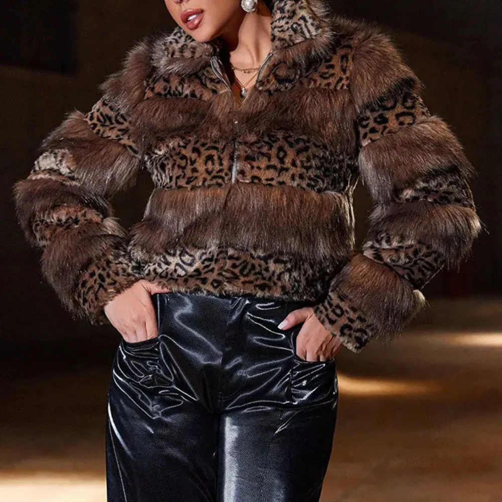 This fur-effect cropped jacket with leopard detailing is the centerpiece for a wildly chic look.