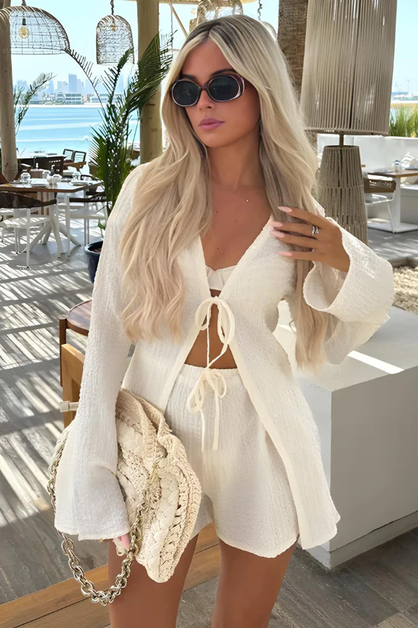 Crafted in a fluid, textured fabric, it seduces with its knotted ties at the front and slightly flared long sleeves.
