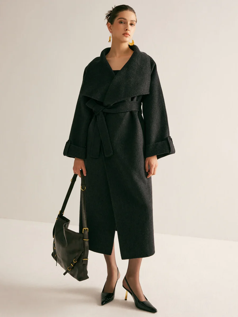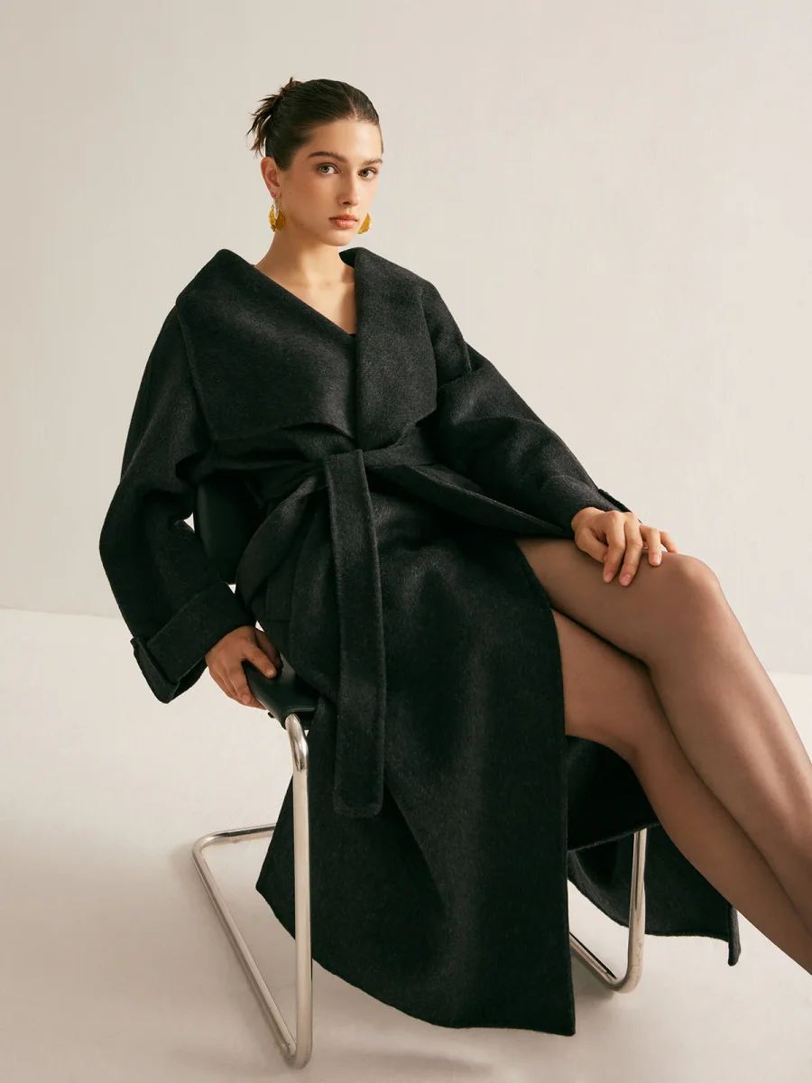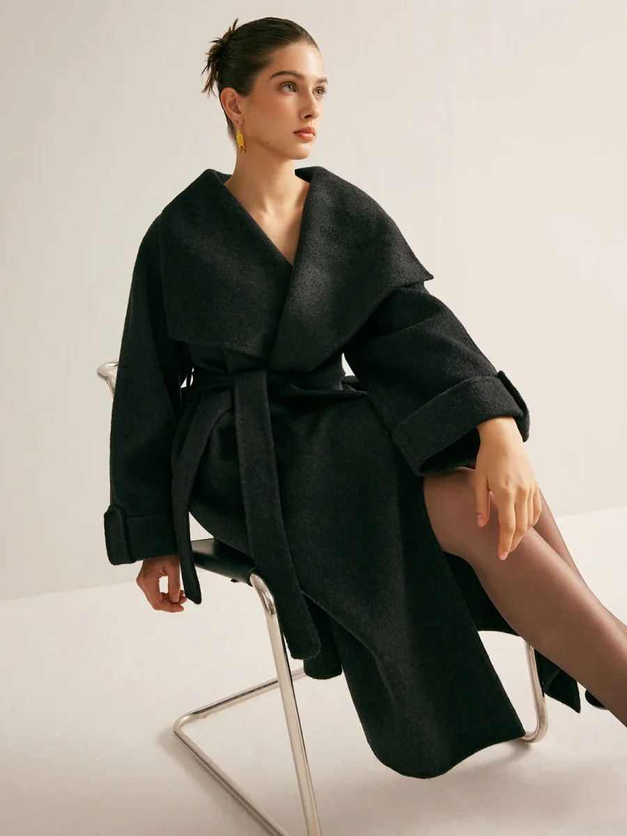 This long black coat with oversized cut and dramatic collar is the definition of chic comfort.