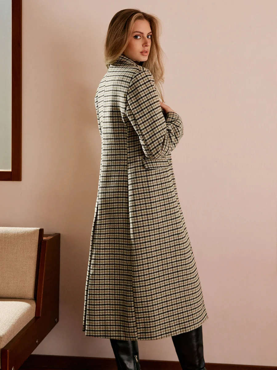 This long plaid coat adds a sophisticated retro touch while remaining modern.