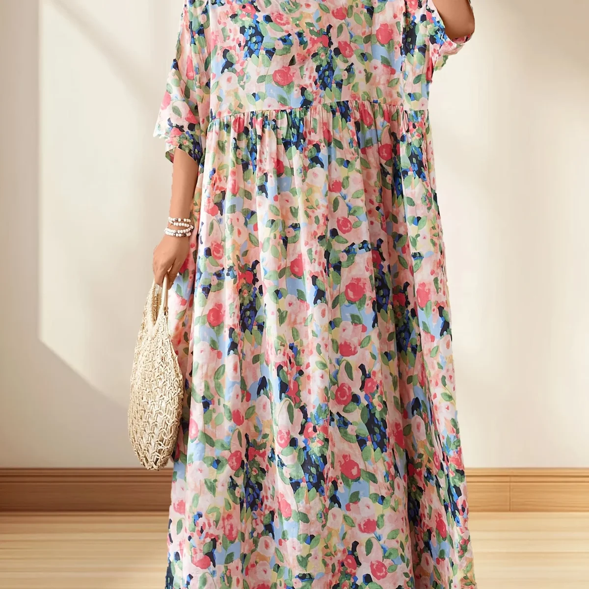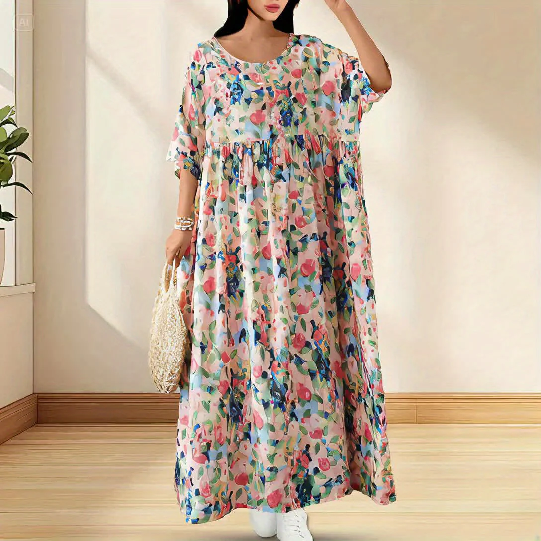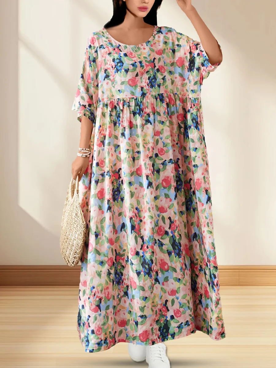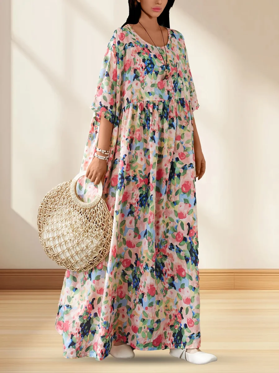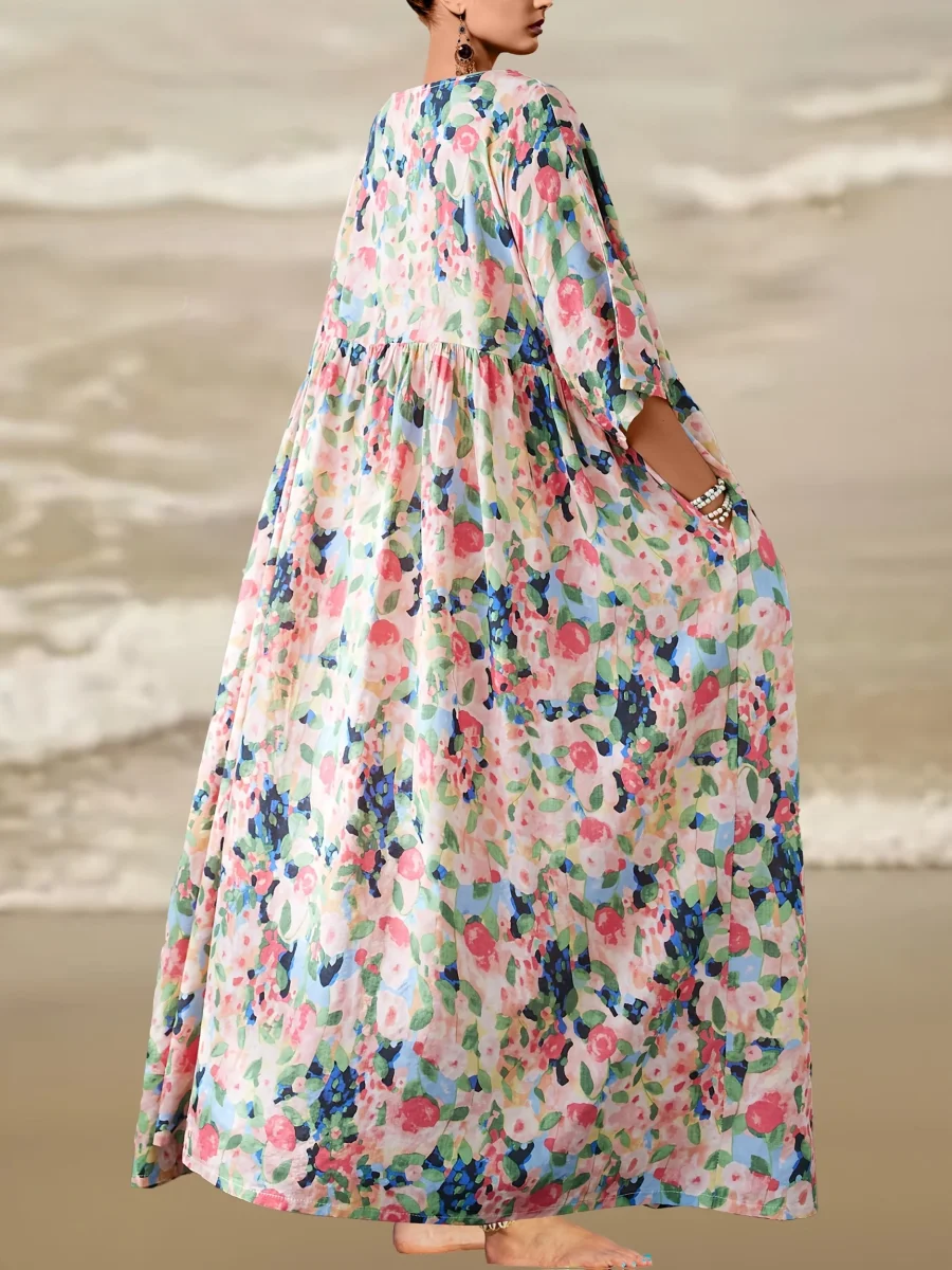 This long dress with multicolored floral print embodies freedom and summer freshness.