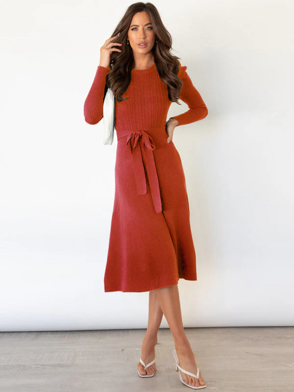 This mid-length knit dress, with its tonal belt, perfectly emphasizes the waist while ensuring a soft, structured look.