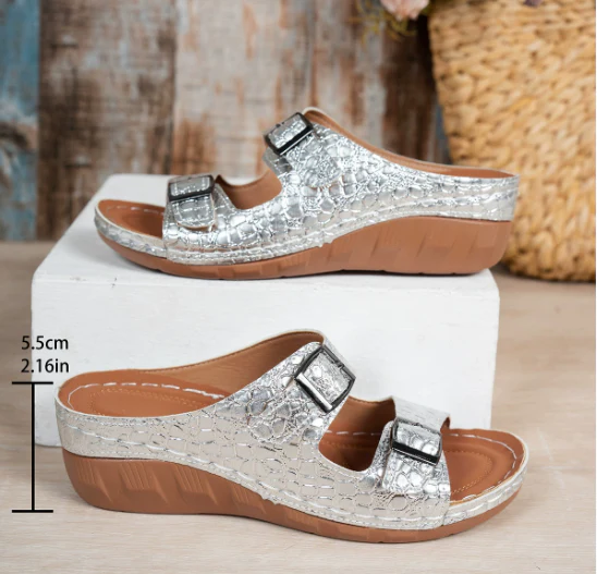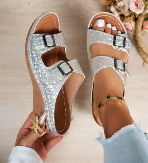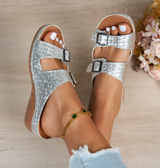 Metallic Buckle Sandals | Comfort and Shiny Style