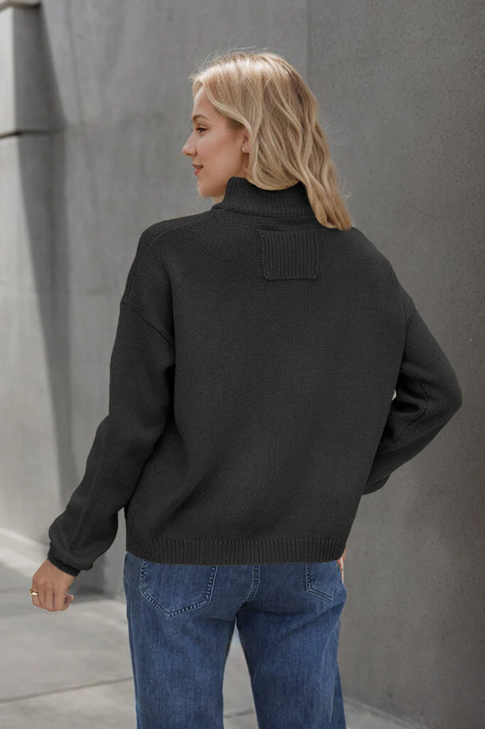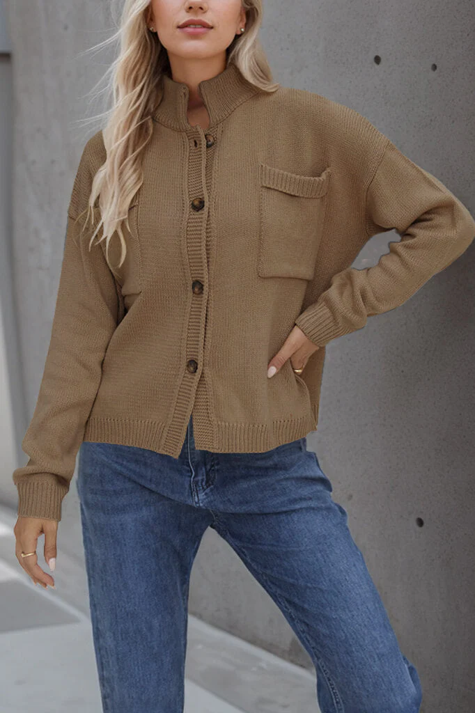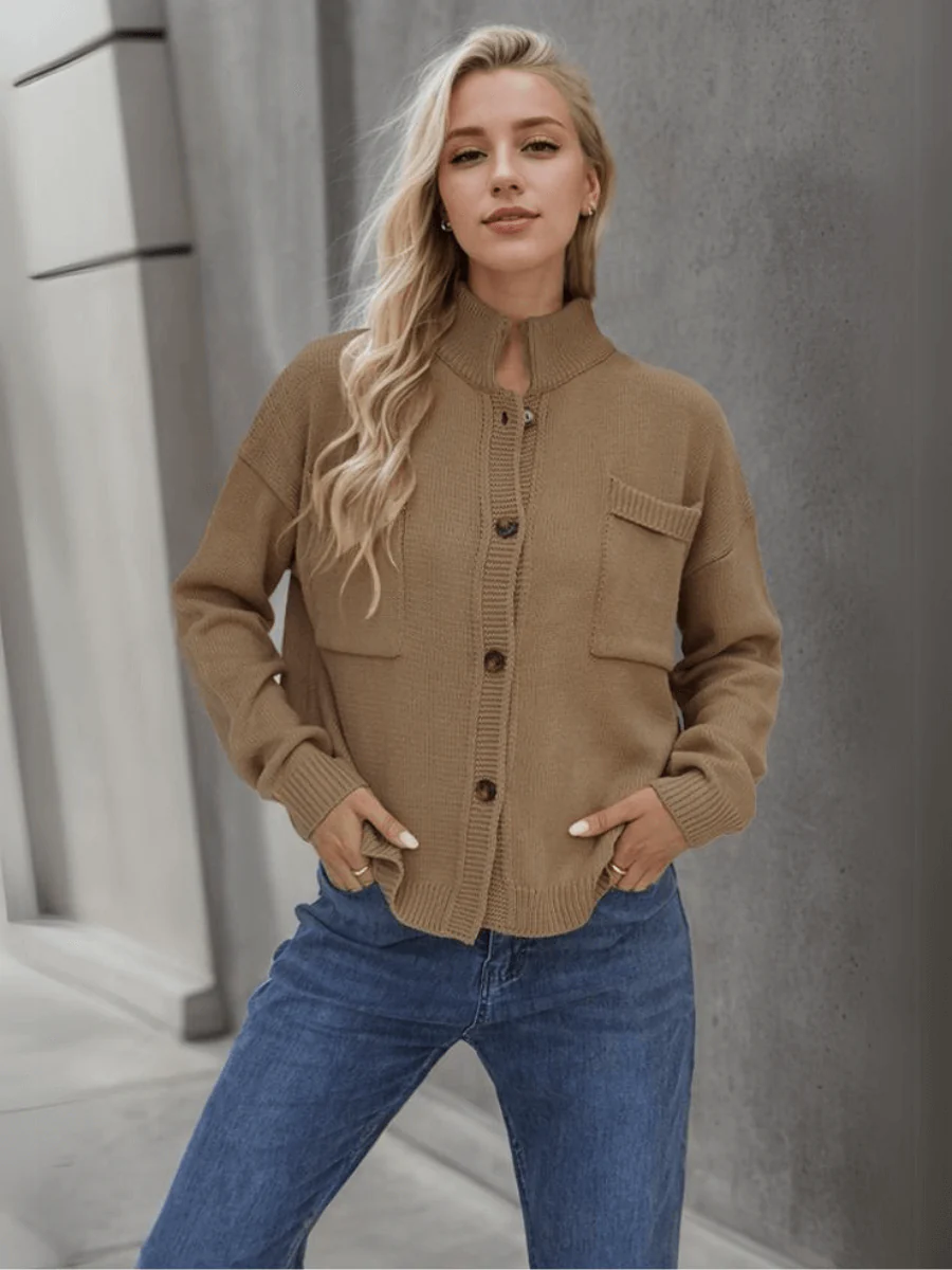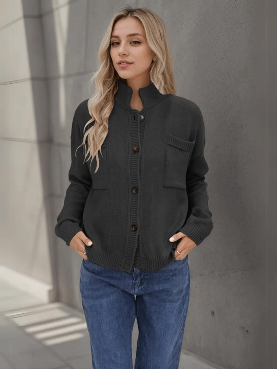 This short cardigan with stand-up collar is both modern and casual.