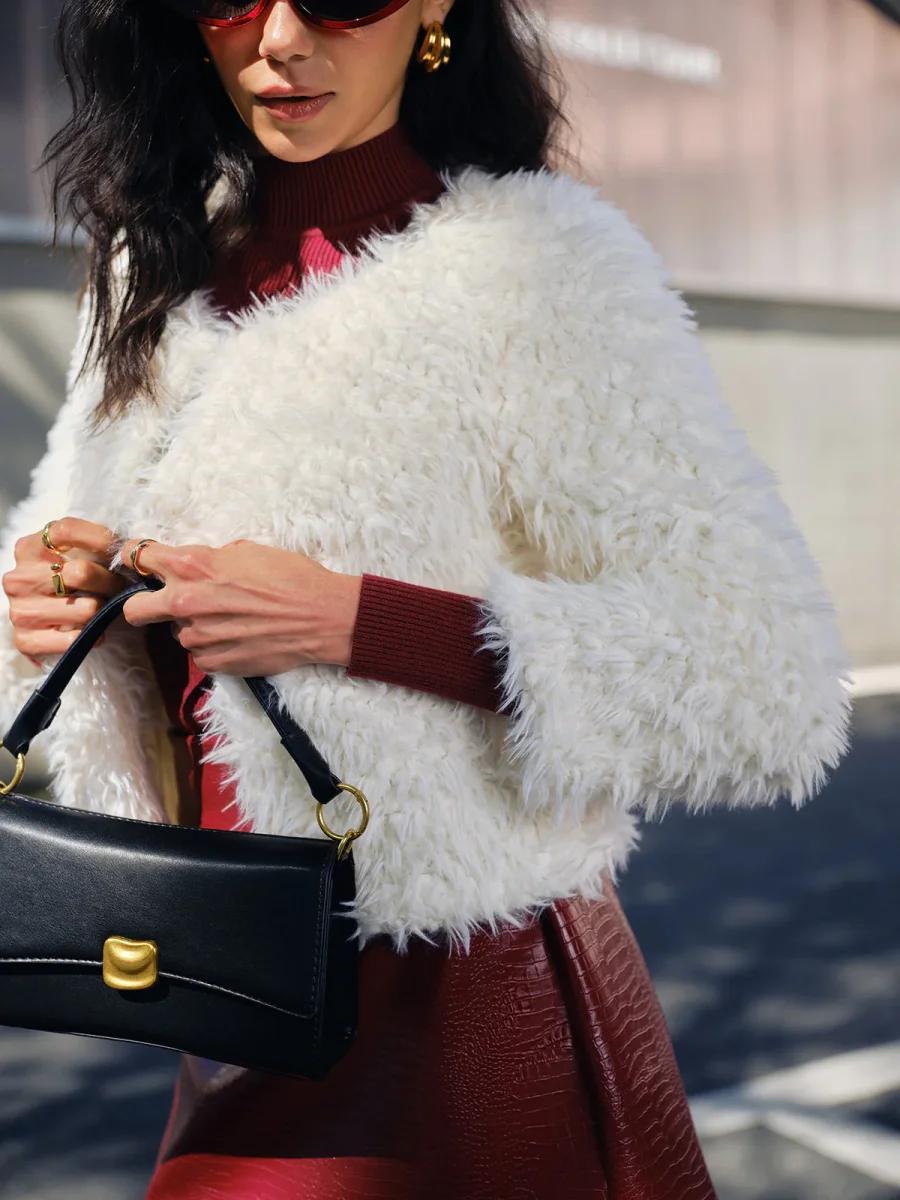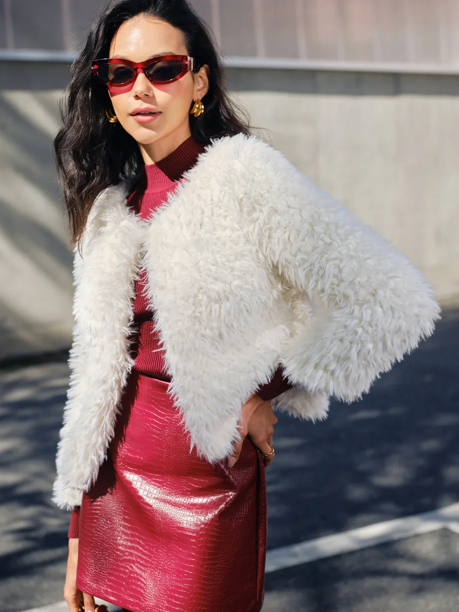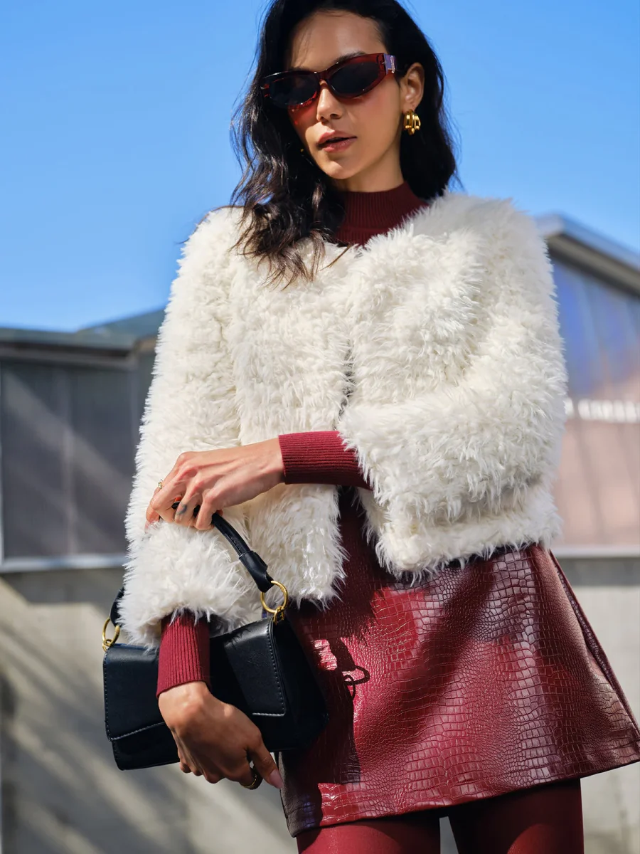 This white faux fur jacket instantly adds a bold, glamorous touch to your look.